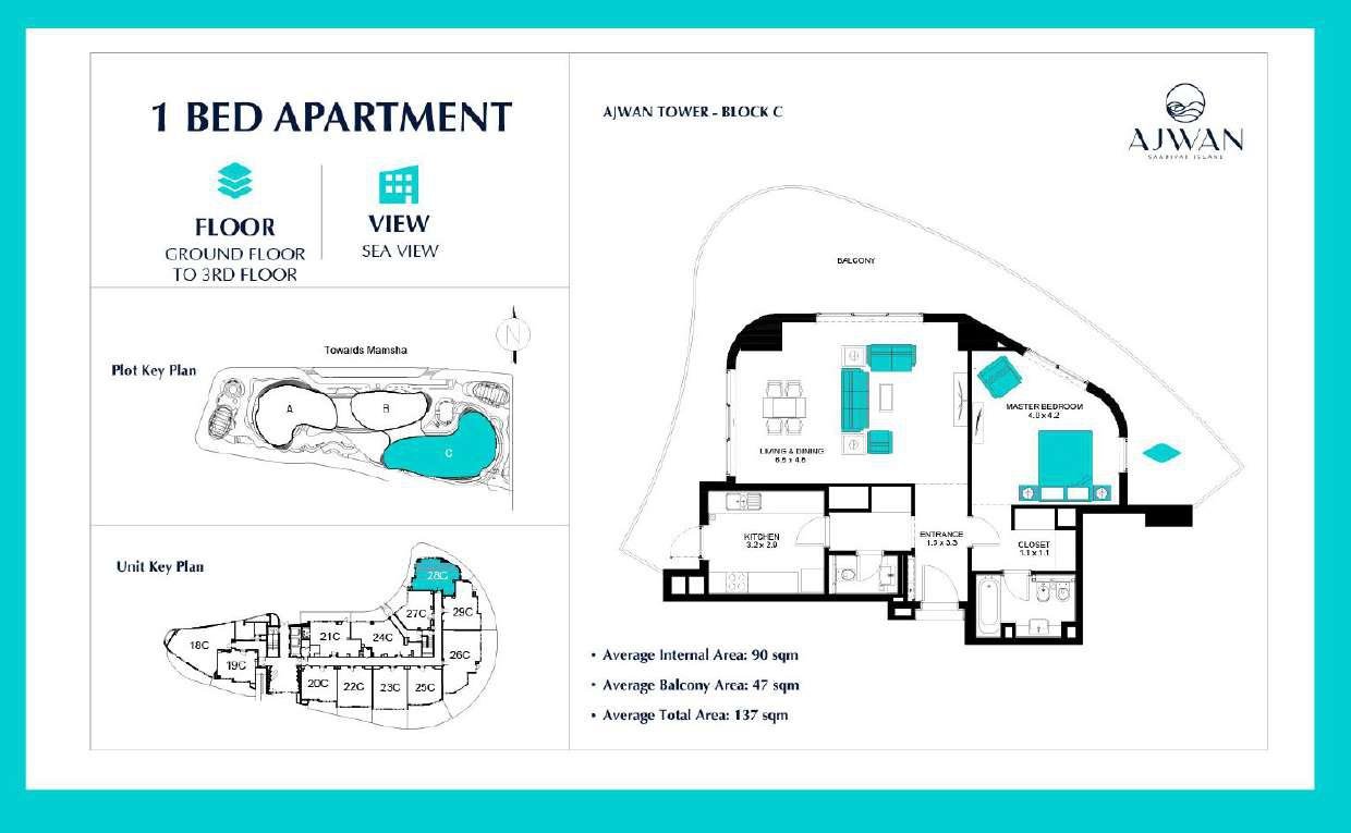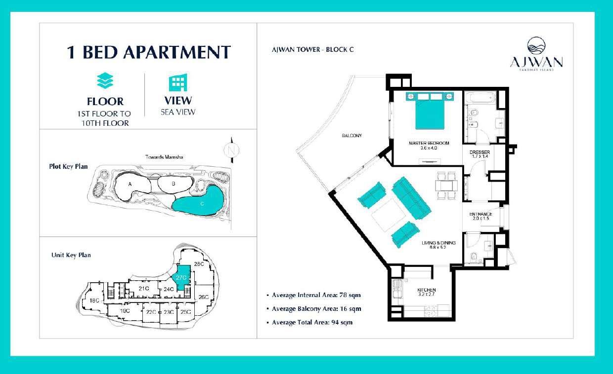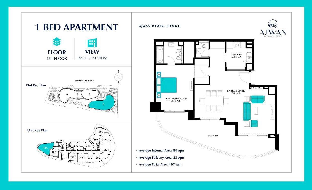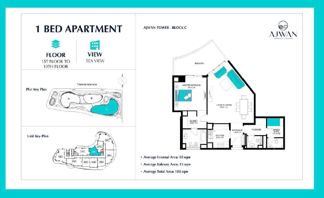 Ajwan Towers features a curated selection of 1–3 bedroom apartments ranging from 78 sq. m to 256 sq. m, designed to meet the needs of modern families, professionals, and investors. Each residence offers open‑concept living spaces, floor‑to‑ceiling windows, and balconies overlooking the sea or cultural landmarks. With 21 thoughtfully planned layouts, buyers can choose from a variety of configurations that maximize natural light, privacy, and functionality. Prices start from approximately AED 2,000,000, making Ajwan Towers a compelling option for luxury property investment in Abu Dhabi.