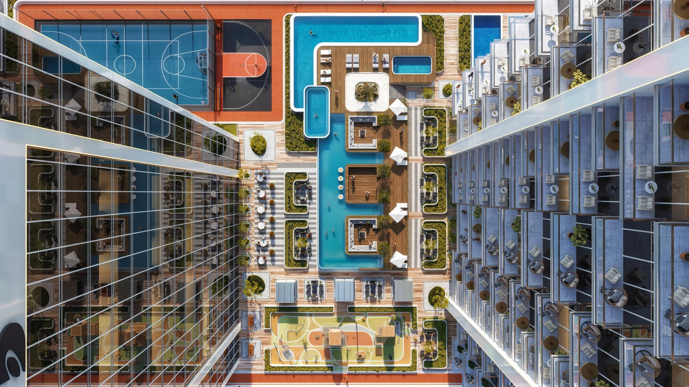 Complementing the residences is a full suite of lifestyle amenities designed to enhance both activity and relaxation. An infinity pool with a dedicated kids’ pool, a fully equipped gym, children’s play areas, and a basketball court provide spaces for wellness and recreation. Landscaped podiums, covered parking, and 24/7 security further enhance convenience, while the office tower delivers a modern business environment with flexible workspaces. Together, Al Vista redefines urban living in Dubai by merging resort-style comfort with seamless city connectivity.