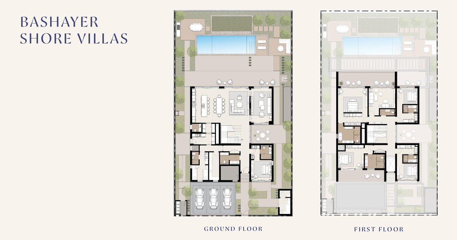 The Bashayer master plan integrates waterfront residences, premium villas, and vibrant community amenities across a thoughtfully designed coastal landscape. Featuring lush parks, shaded walkways, cycling trails, and a 3.5 km promenade, the community promotes wellness and active living. Central to the master plan are the clubhouse, rooftop infinity pool, retail promenade, and family-focused outdoor spaces, creating a harmonious environment where modern architecture blends seamlessly with natural surroundings.