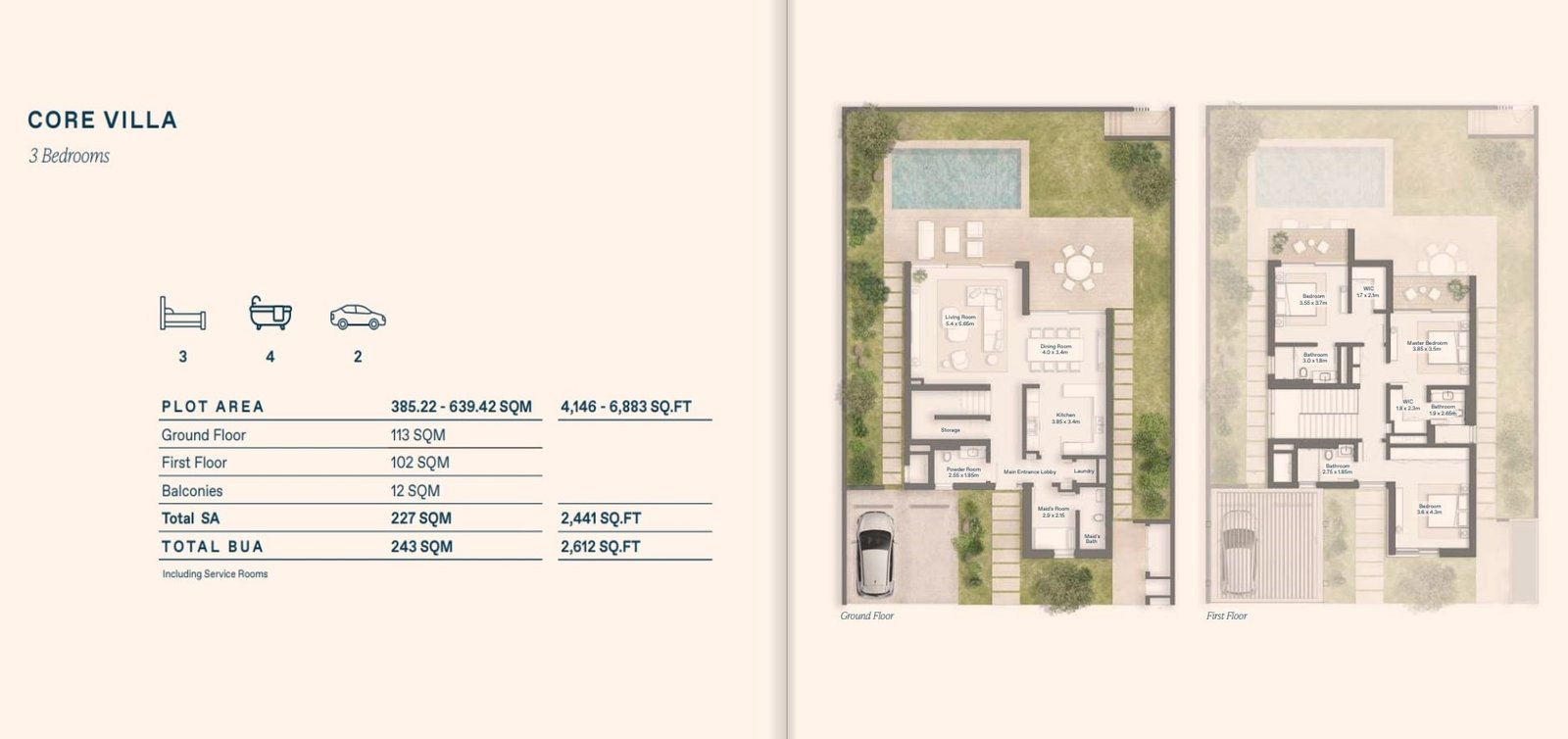 Each villa and townhouse at Bayn Villas is designed to maximize natural light, waterfront views, and open living. Homes feature expansive layouts, double-height ceilings, designer kitchens, ensuite bedrooms, and large terraces or balconies. Lagoon-facing properties offer direct access to water features and landscaped promenades. Every residence integrates sustainable elements and modern finishes to create a luxurious yet practical living environment.