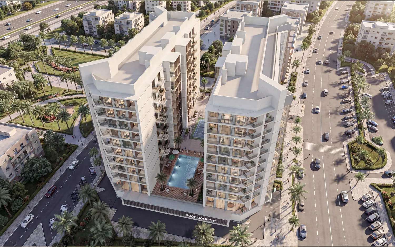 Residents of Comfort by Roof enjoy a wide range of thoughtfully designed amenities that support a comfortable and active lifestyle. The complex features a modern fitness center with professional equipment, a temperature-controlled swimming pool with sun loungers, landscaped outdoor recreation areas, and dedicated relaxation zones where residents can unwind after a busy day. Families benefit from a safe and engaging children’s play area, while the prayer room provides a quiet and respectful space for reflection. In addition, residents have access to secure parking, well-maintained walking paths, and beautifully landscaped surroundings that create a peaceful residential atmosphere within the vibrant Dubailand community.