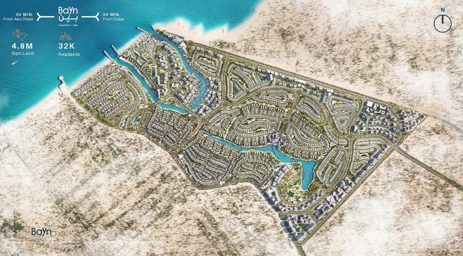 Strategically positioned between Abu Dhabi and Dubai, Bayn offers unmatched connectivity while maintaining a serene coastal atmosphere. Both cities are just 30 minutes away, making it ideal for commuters and frequent travellers. The community’s internal mobility network ensures walkability, while major highways provide smooth access to key destinations across the UAE. Core Villas at Bayn present a rare opportunity to own a single‑row stand‑alone villa in a master‑planned coastal community crafted by ORA. With limited units, premium architecture, and exceptional lifestyle amenities, these villas are designed for families and investors seeking long‑term value, luxury living, and a future‑ready address. Secure your place in one of the region’s most anticipated new destinations.