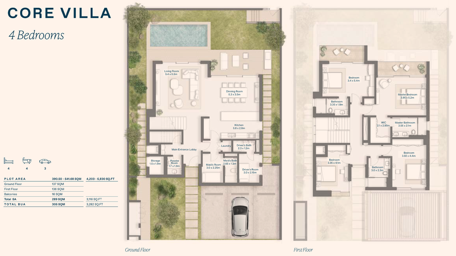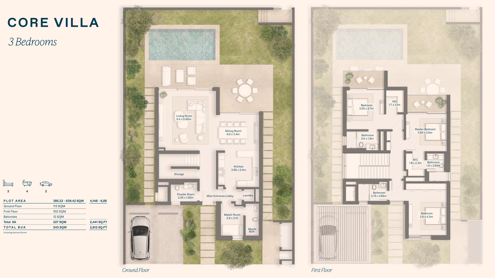 Core Villas at Bayn offer generous built‑up areas ranging from 243 sqm to 305 sqm, thoughtfully designed to maximize comfort, privacy, and natural light. The 3 bedroom villas feature well‑proportioned living spaces, modern kitchens, en‑suite bedrooms, and balconies overlooking landscaped surroundings. The 4 bedroom villas elevate the experience with larger living rooms, expansive master suites, additional storage, and enhanced outdoor areas. Each villa includes a maid’s room, dedicated service spaces, and private parking, making them ideal for families seeking functional yet elegant homes.
