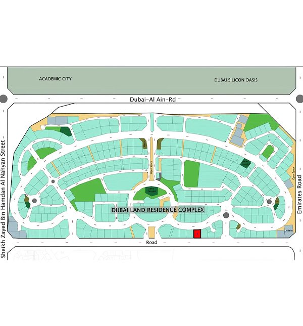 The Dubai Land Residence Complex (DLRC) master plan is a thoughtfully designed, mixed-use community within Dubailand, Dubai, strategically located along Dubai–Al Ain Road (E66) and Emirates Road (E611) for excellent connectivity. The layout integrates low- to mid-rise residential blocks, retail plots, schools, parks, and leisure zones, with pedestrian-friendly walkways and landscaped open spaces. Each cluster is designed for balanced density, sunlight, and ventilation, while amenities such as jogging tracks, gardens, and community centres support a modern lifestyle. The plan emphasizes accessibility, connectivity, and integrated living, making DLRC attractive for families, professionals, and investors seeking long-term growth potential.
