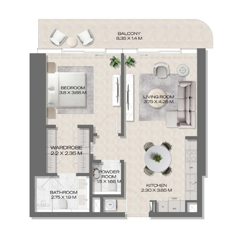 Premium materials meet masterful execution throughout. Natural light interacts with carefully selected finishes—warm neutrals evoking Arabian landscapes, accents of azure reflecting the Gulf waters, and metallic touches echoing the city’s modern sophistication.
