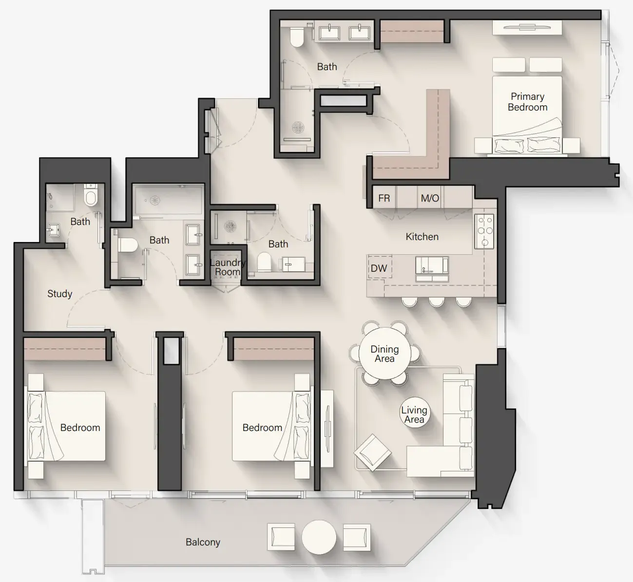 Residents of Towers 1 & 2 enjoy an exceptional array of lifestyle amenities distributed across multiple clubhouse levels — from wellness to social connection. The project features multiple swimming pools, bubble therapy pools, sun loungers, padel courts, indoor and outdoor fitness zones, and yoga platforms. Families benefit from kids’ pools, outdoor play areas, and dedicated game rooms, while adults can relax across spa suites, steam and sauna facilities, retreat lounges, cinema rooms, dance studios, and co-working clubs. Ground-level features such as retail, F&B terraces, community lake paths, pet areas, and courtyards complete a holistic community experience.