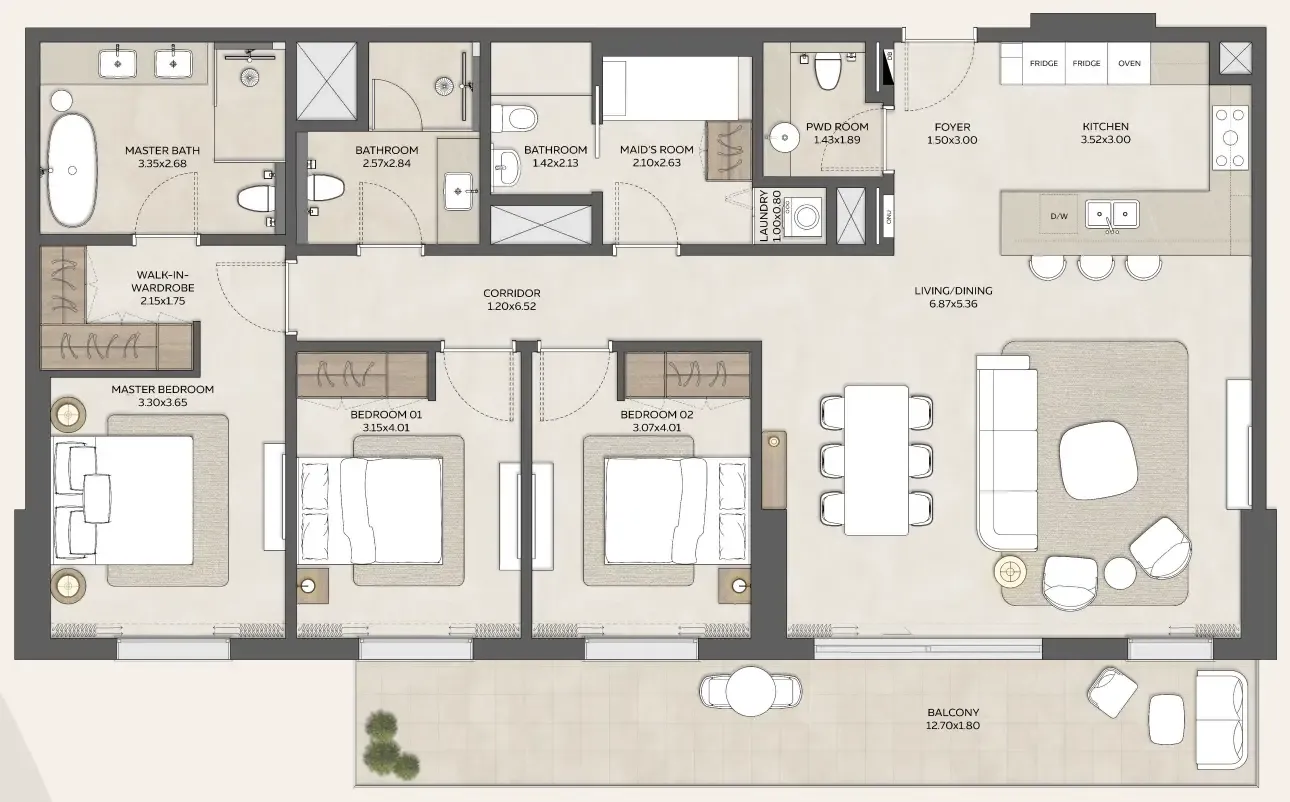 The interiors of Ghadeer reflect a refined, nature-led aesthetic, showcased through soft natural tones, warm neutrals, contemporary wood finishes, and clean architectural detailing. Large windows invite abundant natural light, enhancing the sense of openness and balance throughout each home. Two interior palettes — Timeless Elegance, with its refined monochrome character, and Calm Canvas, inspired by natural textures and materials — allow residents to choose a style that aligns with their personal sense of serenity and understated luxury.