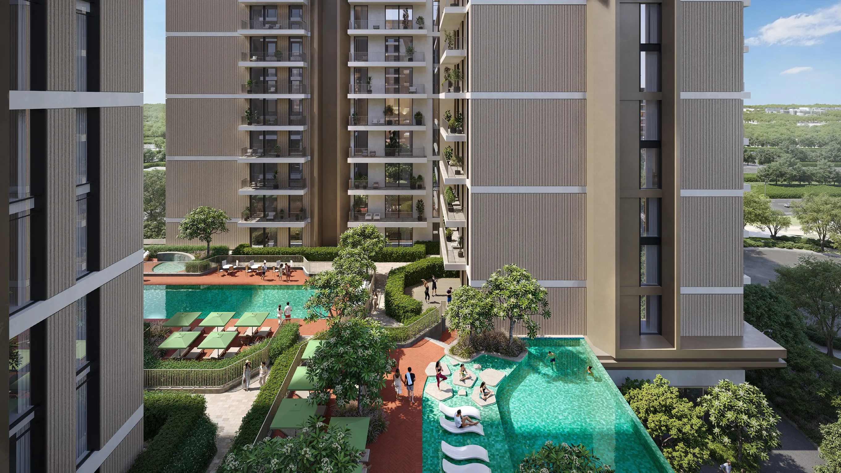 Residents of Ghadeer enjoy seamless access to the extensive lifestyle and wellness amenities thoughtfully distributed across the ground floor and podium levels of the community. These include multiple swimming pools with lap, infinity, and children’s areas, main and satellite gyms, yoga spaces, an indoor kids’ club, prayer rooms, an indoor games room, multipurpose halls, BBQ and outdoor dining areas, a vibrant community plaza, and landscaped event lawns. Together, these amenities create a resort-like atmosphere that supports wellbeing, leisure, and social connection.