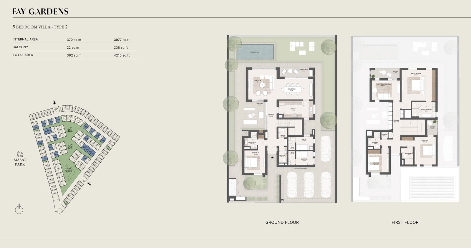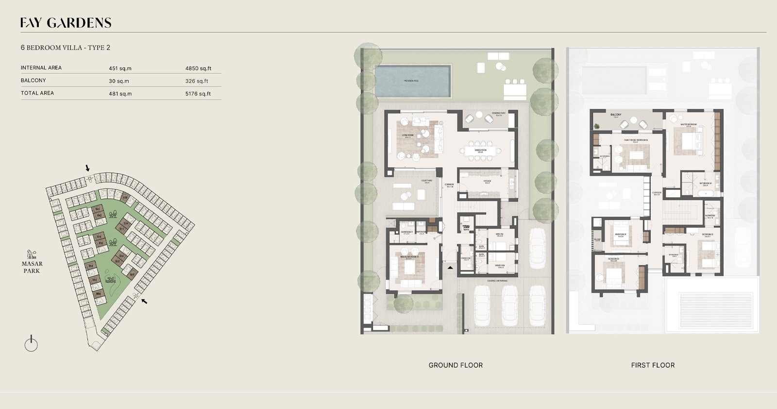 Property options include spacious four-bedroom villas starting at 3,469 sqft, elegant five-bedroom residences at 4,215 sqft, and grand six-bedroom villas reaching up to 5,176 sqft. Each home is crafted using sustainable materials and features open-plan layouts, generous majlis rooms, abundant natural light, and seamless indoor–outdoor transitions. Select units include private pools, maid’s rooms, driver’s rooms, and expansive terraces, delivering a lifestyle centered on privacy, comfort, and modern elegance.