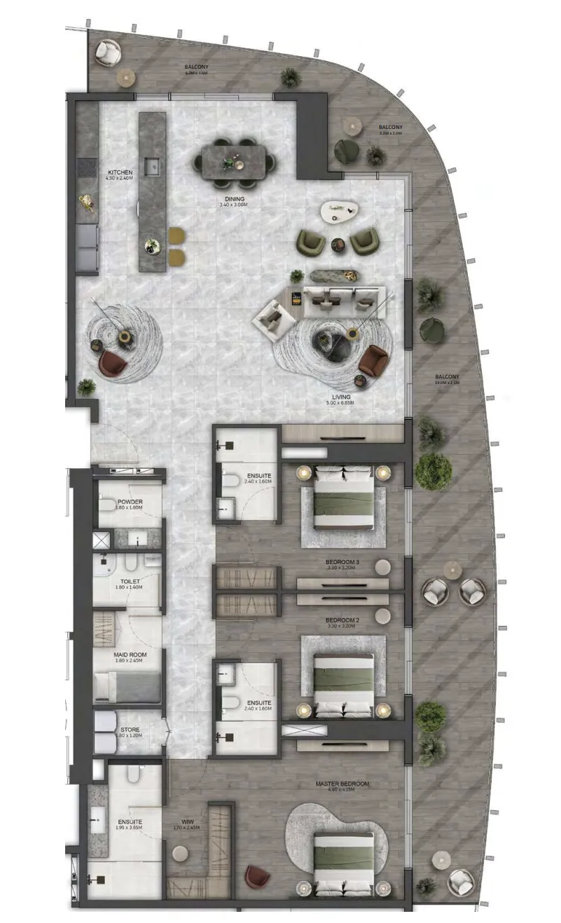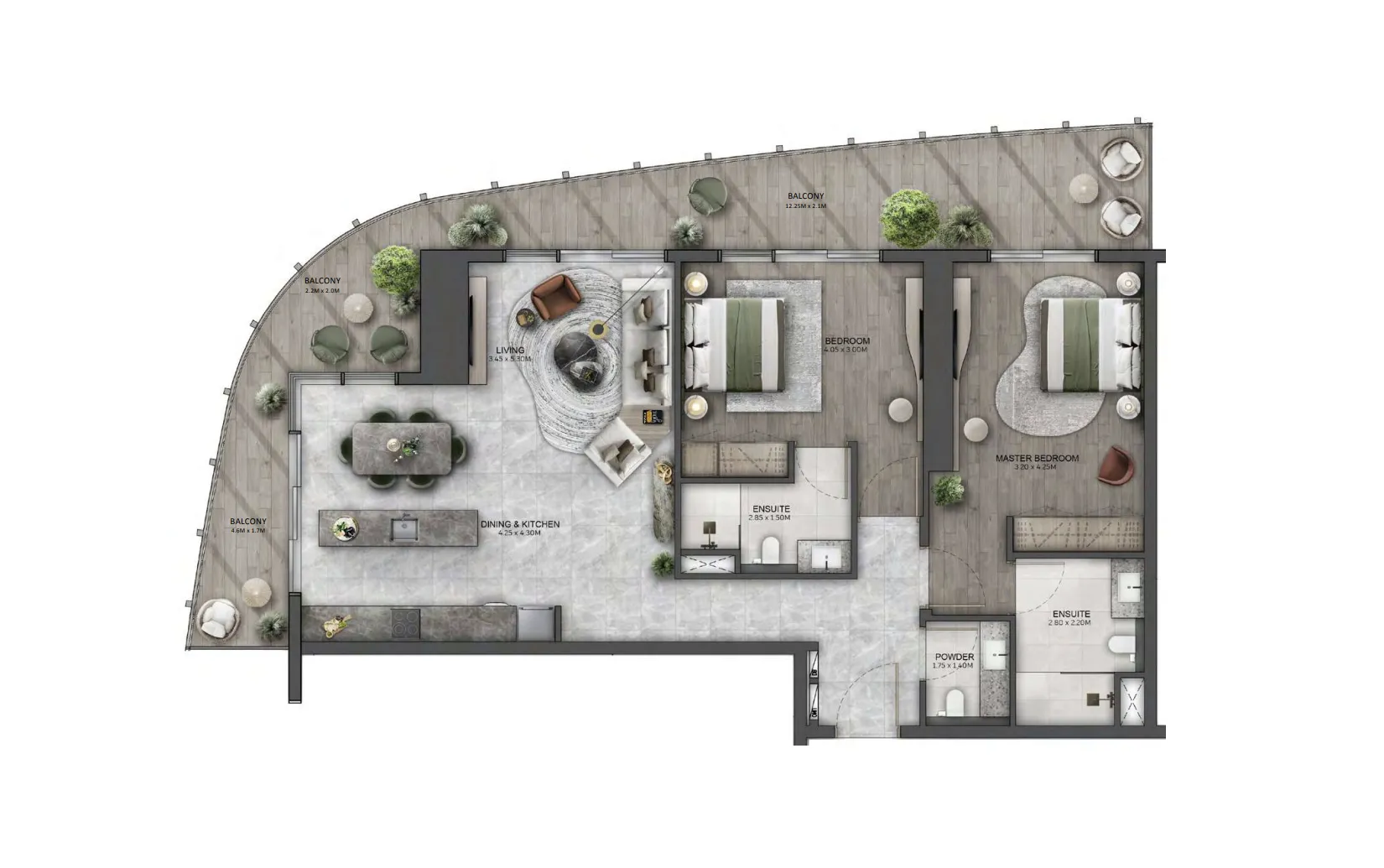 Inside the residences, generous layouts, fluid terraces, and canyon-style balconies invite natural light deep into the interiors, giving each home a sense of freedom and quiet sophistication. Surrounded by vertical gardens and expansive views, every apartment becomes a sanctuary where modern elegance meets a calm, effortless lifestyle.