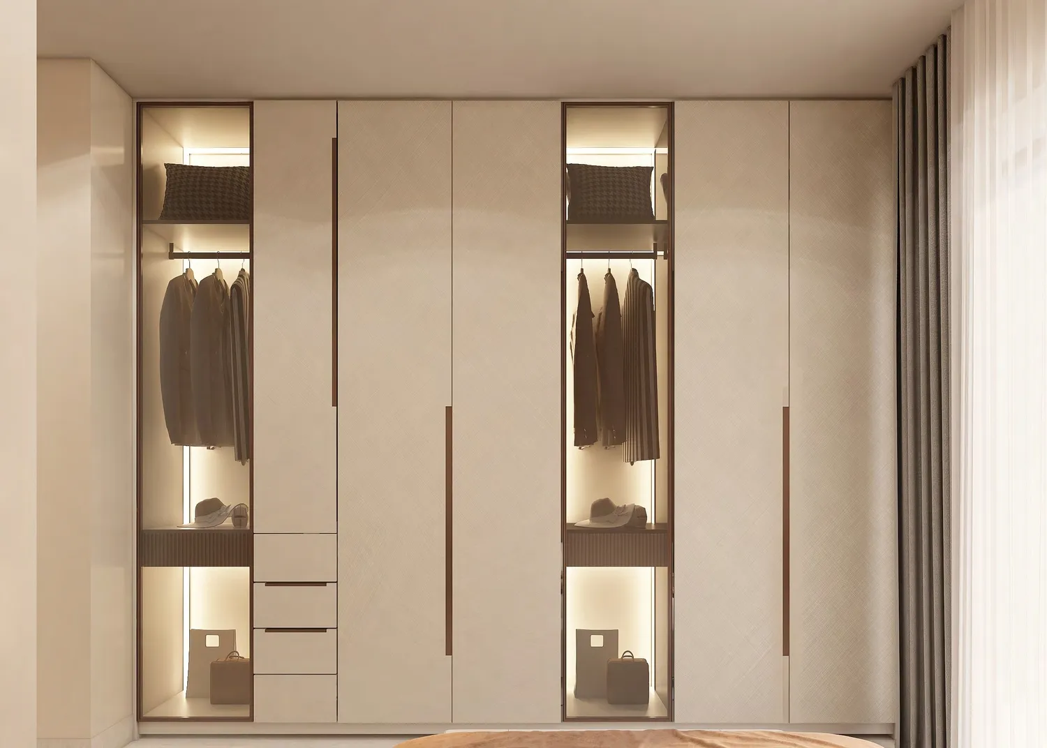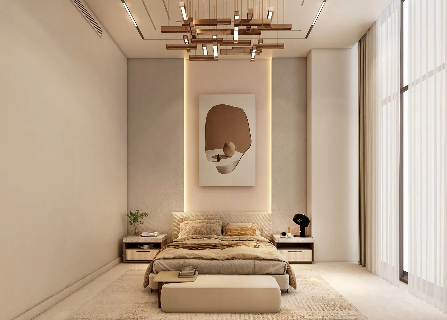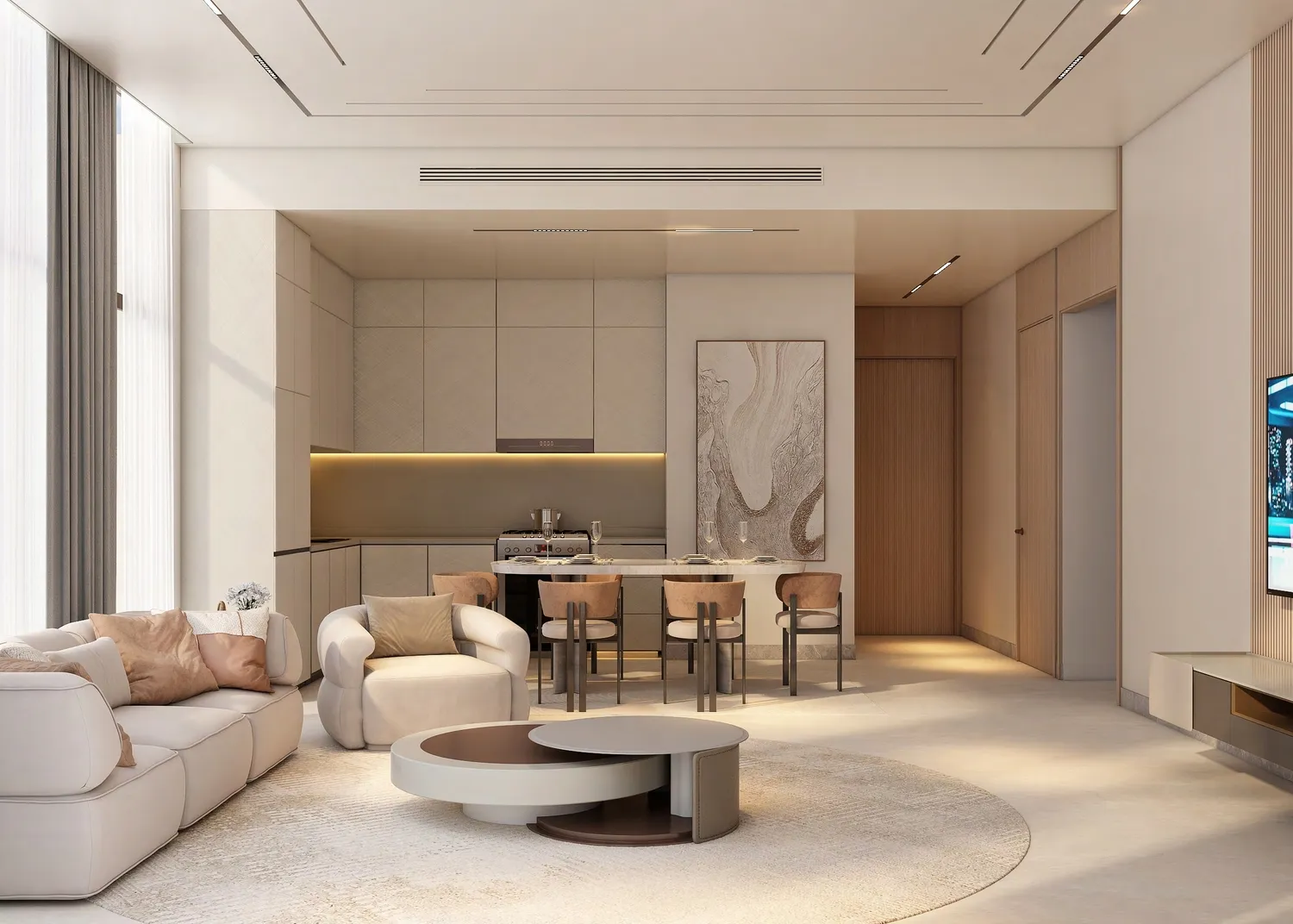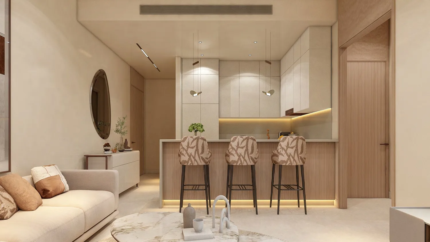 All apartments come fully furnished, featuring modern kitchen appliances and interiors designed with refined finishes, soft textures, and warm, contemporary tones. The materials throughout the building emphasize quality and longevity, enhancing both the tactile and visual experience of each space. Elegant lighting, clean surfaces, and carefully selected fixtures contribute to an atmosphere of understated luxury.