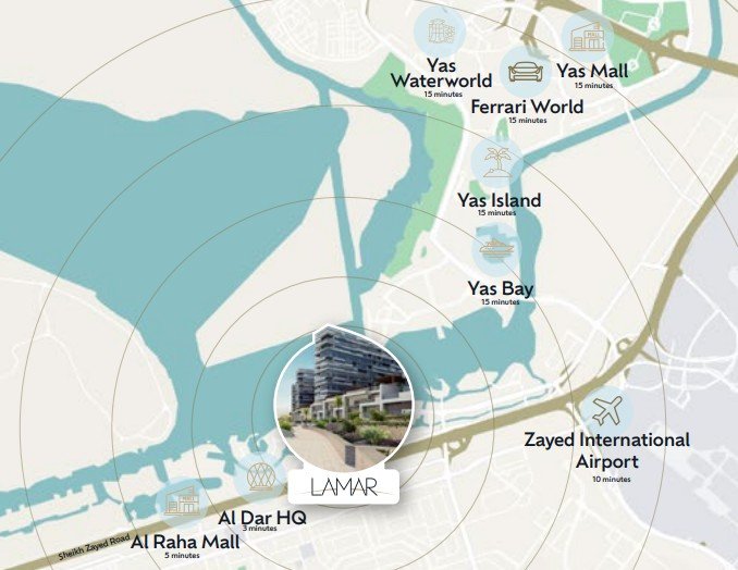 Situated in the heart of Al Raha Beach, Lamar Residence enjoys exceptional connectivity to Abu Dhabi’s major destinations. Residents are just minutes from Yas Island, Zayed International Airport, and key business districts. The community is surrounded by top-tier schools, medical centers, supermarkets, and leisure attractions, making it ideal for families and professionals. With quick access to major highways, commuting to central Abu Dhabi or Dubai is effortless, further boosting the project’s investment appeal.