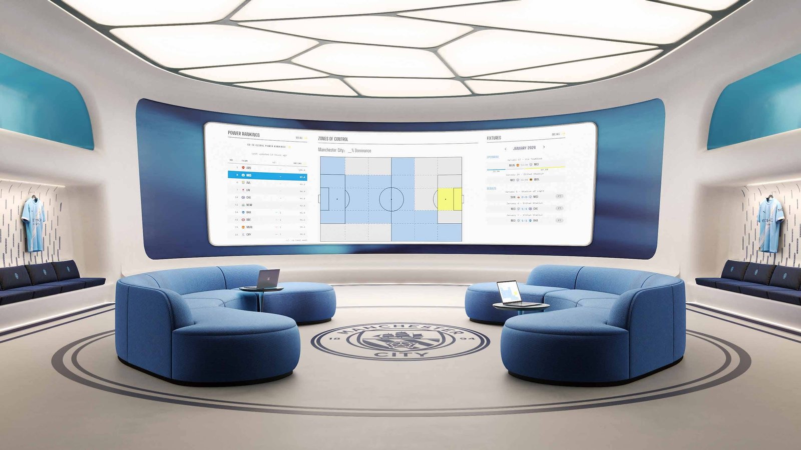 - Manchester City Training Academy, football fields, tactical room, and performance studios