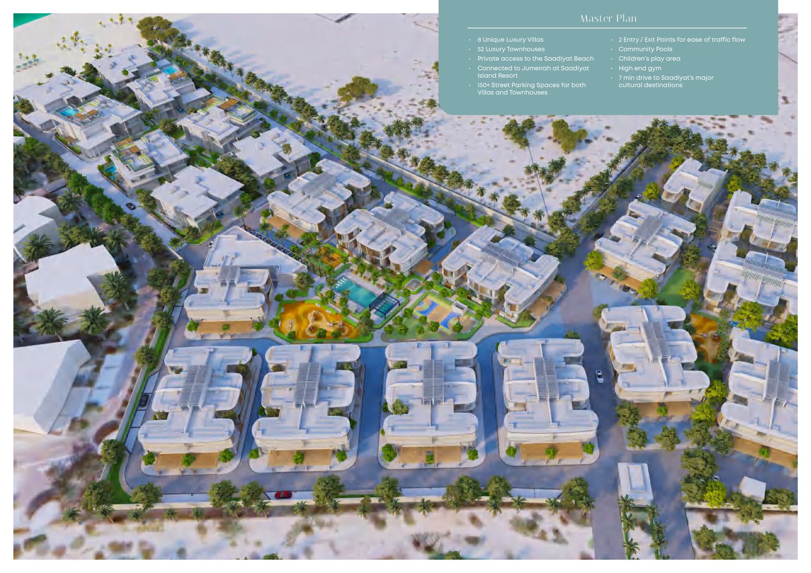 Murjan Al Saadiyat offers more than just a home — it delivers a sophisticated lifestyle that masterfully balances luxury with the calming rhythms of nature. Each villa and townhouse is thoughtfully positioned to maximize natural sunlight on rooftop terraces, while providing shaded retreats and minimizing shadow impact on outdoor living areas. Public zones and landscaped pathways are carefully planned to harness the cooling sea breezes of Saadiyat Island, creating a refreshing, light-filled atmosphere across the entire community.