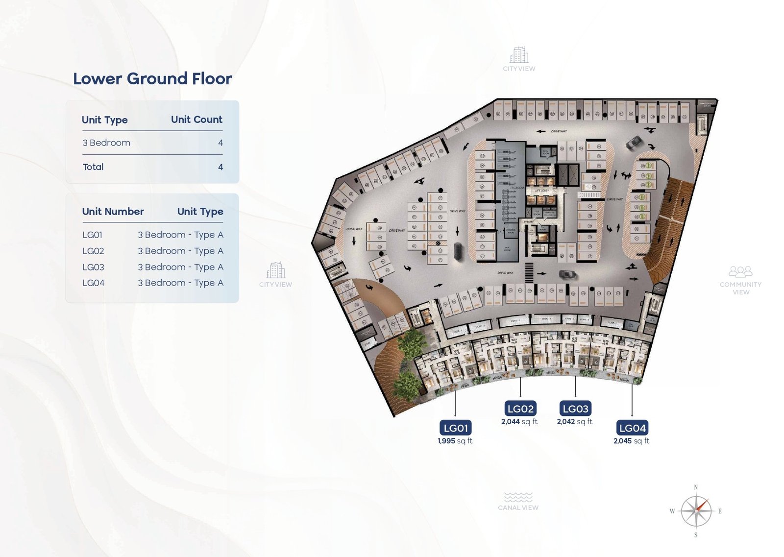 - Lower Ground Floor: 4 × 3BR Double-Height Units