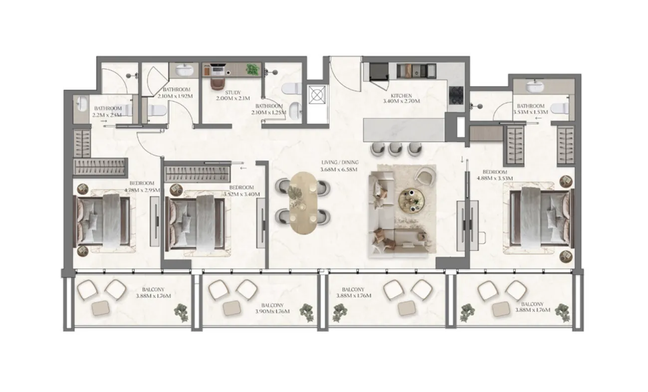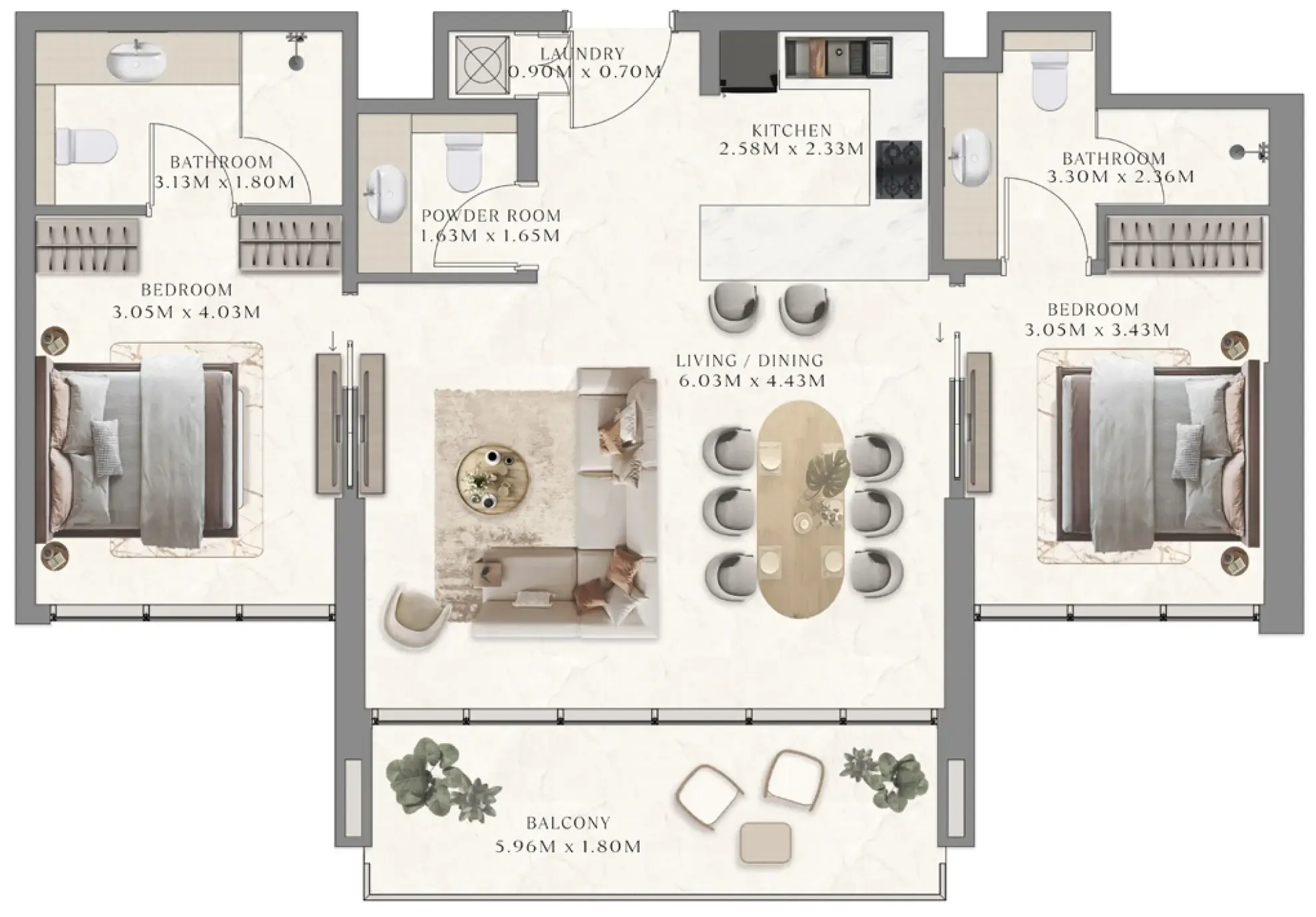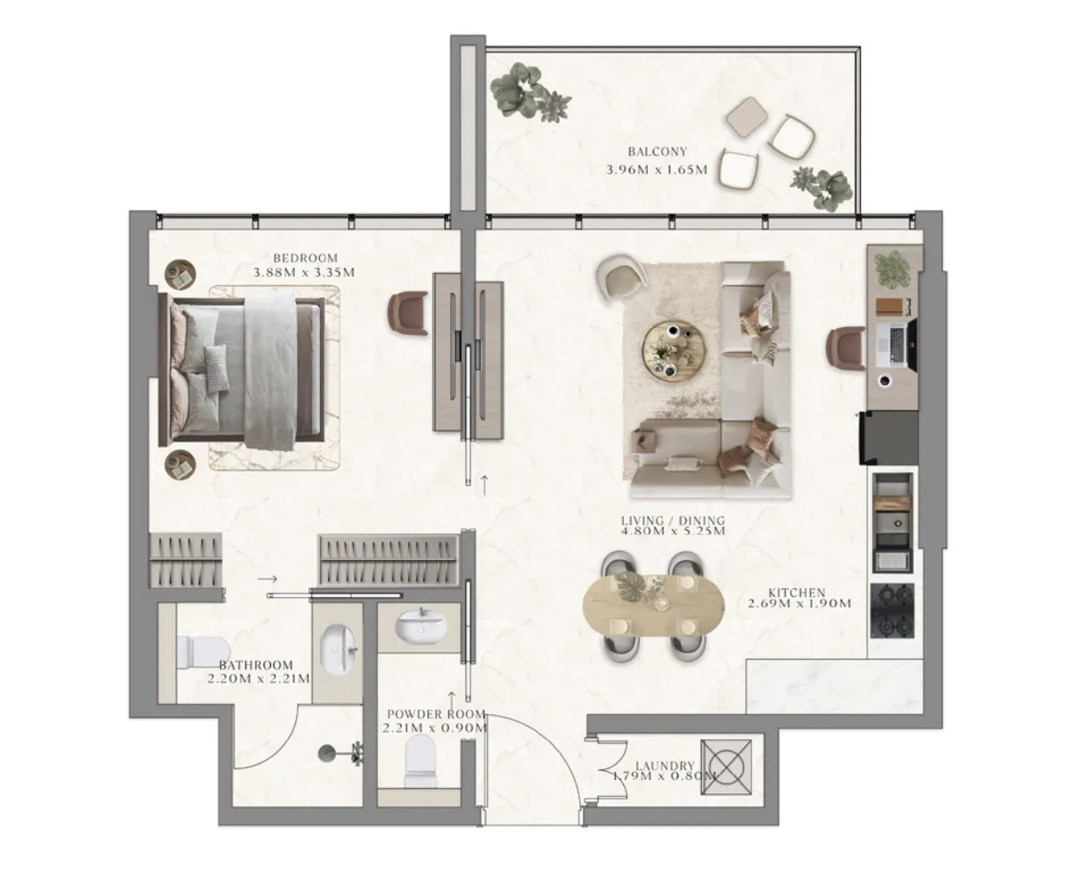 Inside, the fully furnished residences redefine the concept of move-in-ready living. Each home — meticulously styled and layered with texture and tone — reflects a cosmopolitan aesthetic that balances comfort with confidence. Generous layouts, premium finishes, Bosch appliances, and Grohe sanitaryware elevate every detail, while natural light and serene palettes bring warmth and sophistication to every corner. Designed for both end-users and investors, each space offers functionality, flow, and timeless appeal.