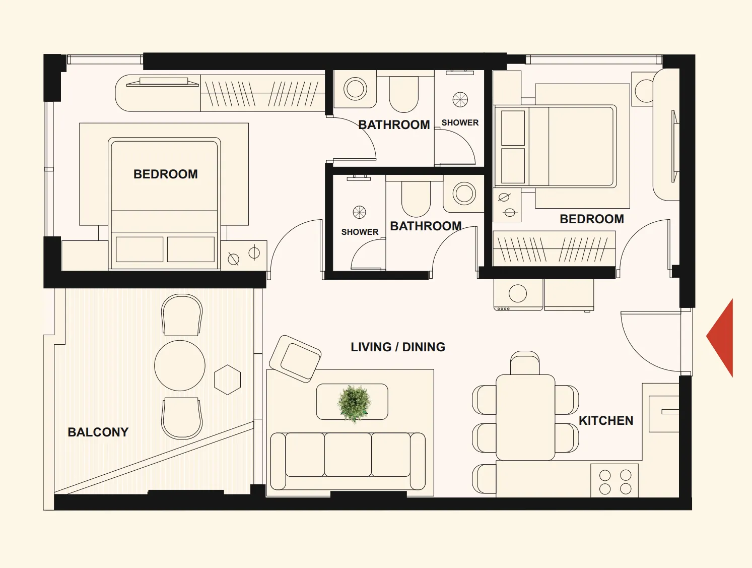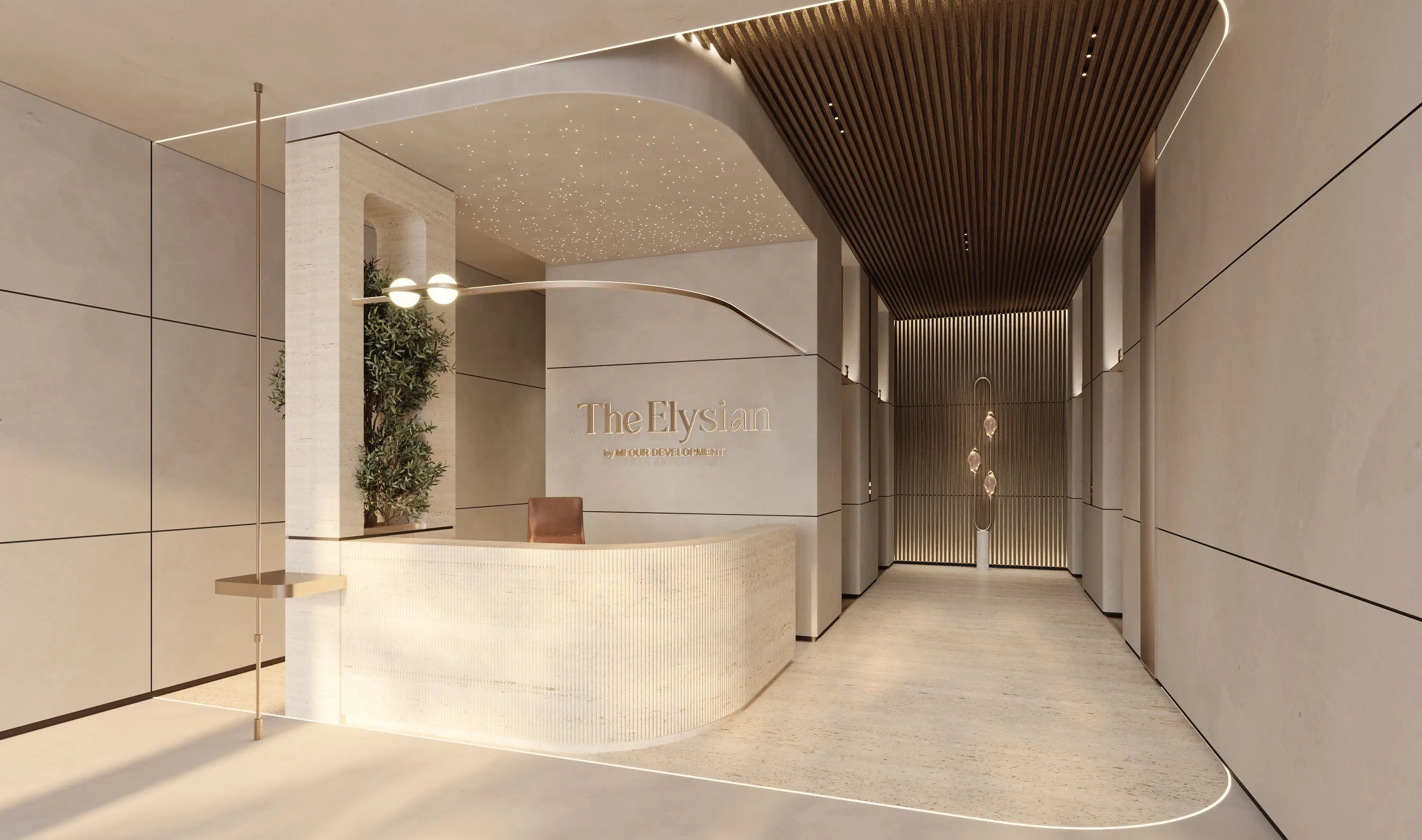 Interiors are finished with warm, high-quality materials that create a calm and elegant atmosphere throughout each home. Kitchens feature modern cabinetry, quartz countertops with terrazzo effect, and smart storage solutions, while bedrooms include built-in wardrobes with refined finishes. Flooring, bathrooms, fittings, and lighting are all carefully selected, combining wood-effect floors, porcelain tiles, brass accents, and floor-to-ceiling windows for a polished, contemporary, and luxurious feel.