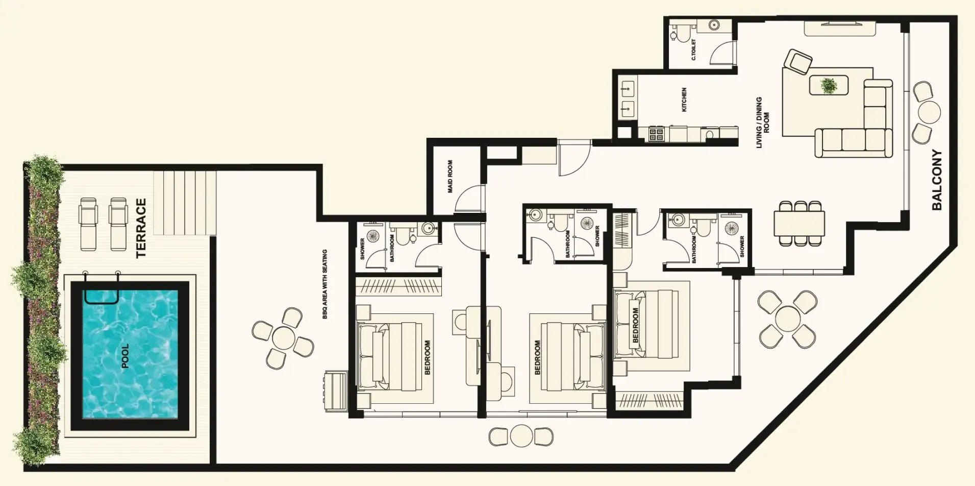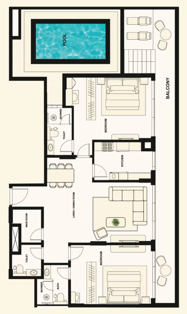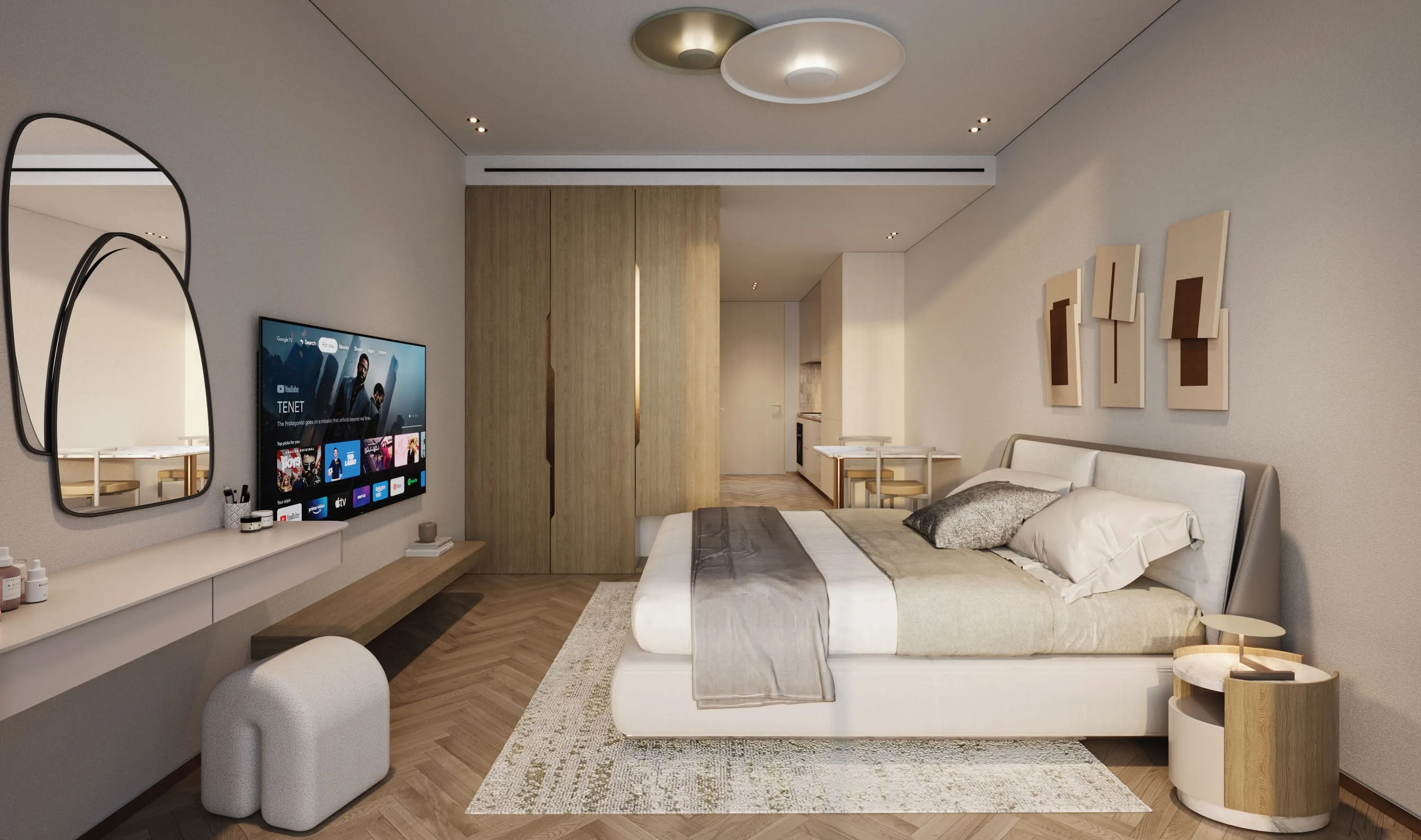 Residents enjoy a rich collection of amenities designed for both energy and relaxation, including a swimming pool with sun deck, kids’ pool, indoor and outdoor gyms, steam and sauna rooms, and a table tennis court. Social spaces such as the rooftop lounge, outdoor cinema, BBQ area, and cabanas create a perfect setting for gatherings and memorable evenings. Every amenity is thoughtfully planned to support an active, balanced, and enjoyable daily life.