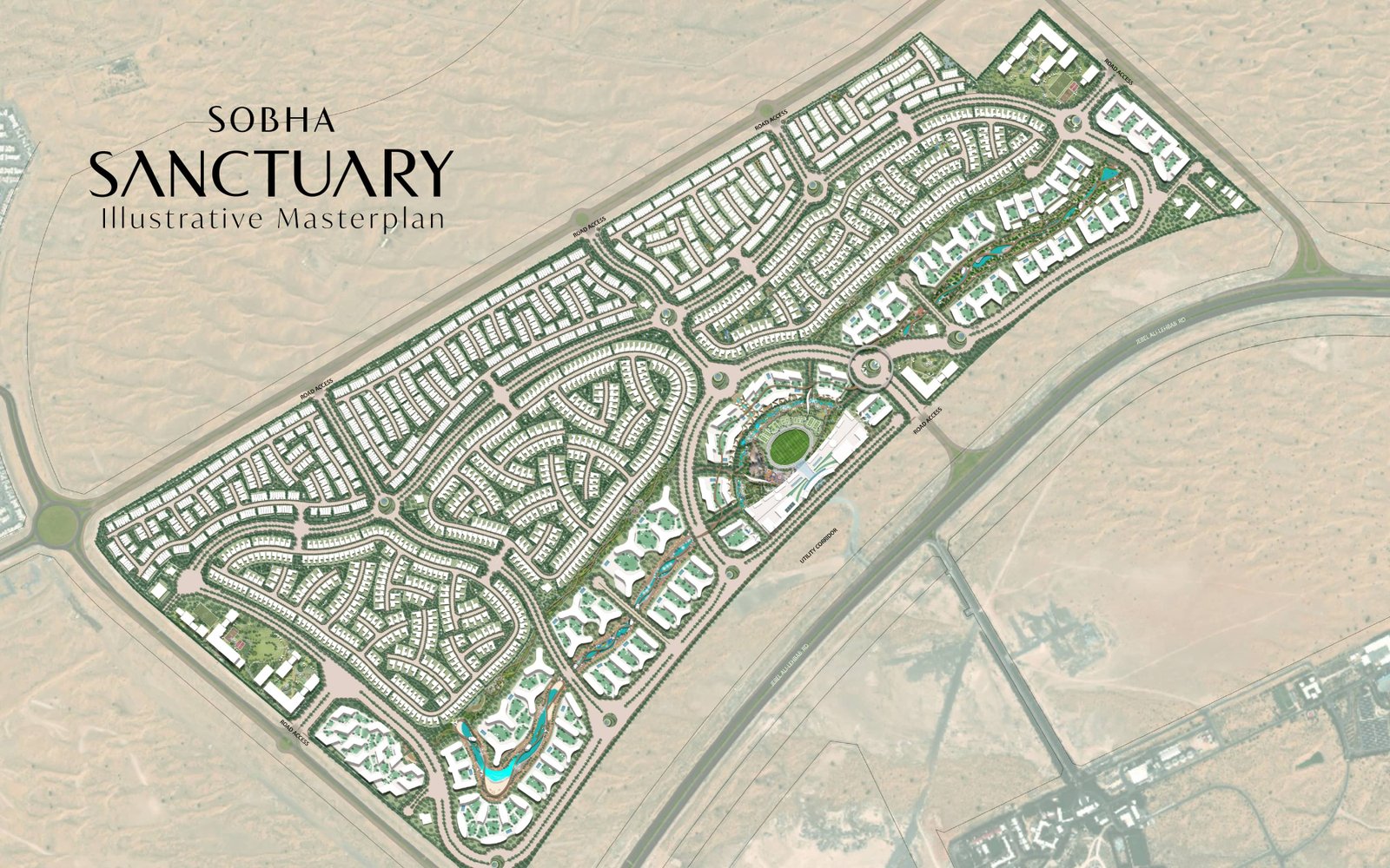 The master plan of Sobha City Abu Dhabi – Phase 1 is envisioned as a next‑generation community aligned with Abu Dhabi’s 2030 vision, featuring expansive open landscapes where 60% of the development is dedicated to parks and green spaces. Designed across 38 million sq.ft, it integrates yacht and commercial zones, a 2 km waterfront promenade, and over 50,000 trees, creating a naturally immersive, future‑ready environment that blends luxury living with sustainable urban planning.