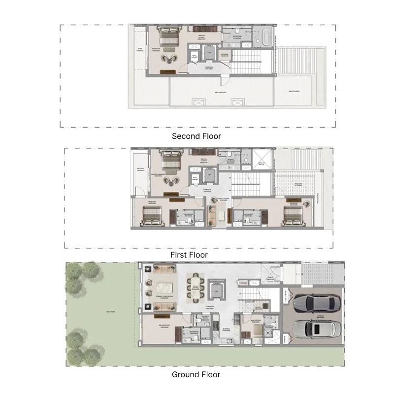 Each villa at The Terraces are designed with functionality, comfort, and adaptability in mind. Interiors feature spacious layouts with well-defined living, dining, and private areas, complemented by high-quality finishes and modern fittings. Select villas include premium features such as private lifts, swimming pools, and covered parking. Large windows and open-plan designs enhance natural light and ventilation, while the overall material palette reflects a contemporary and refined aesthetic, allowing residents to personalize and furnish their homes to suit their lifestyle needs.