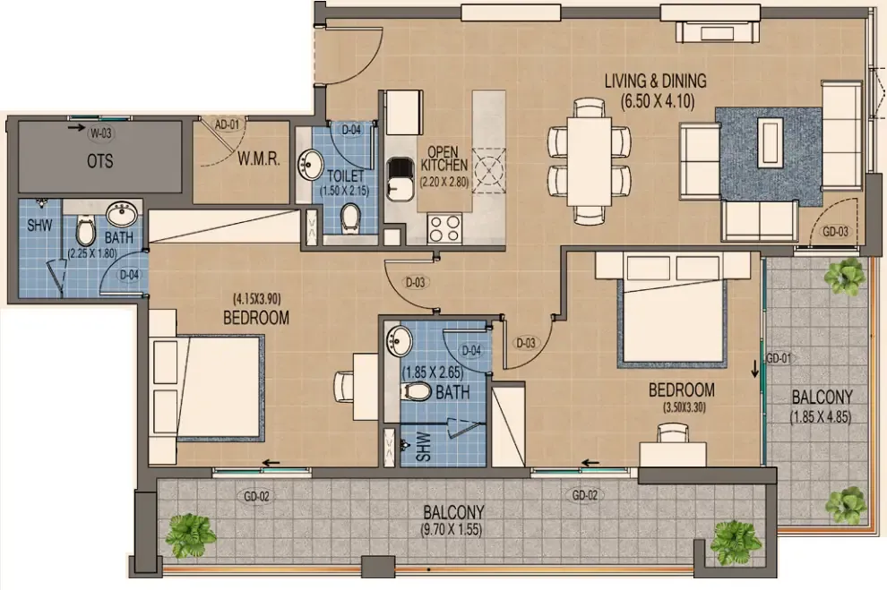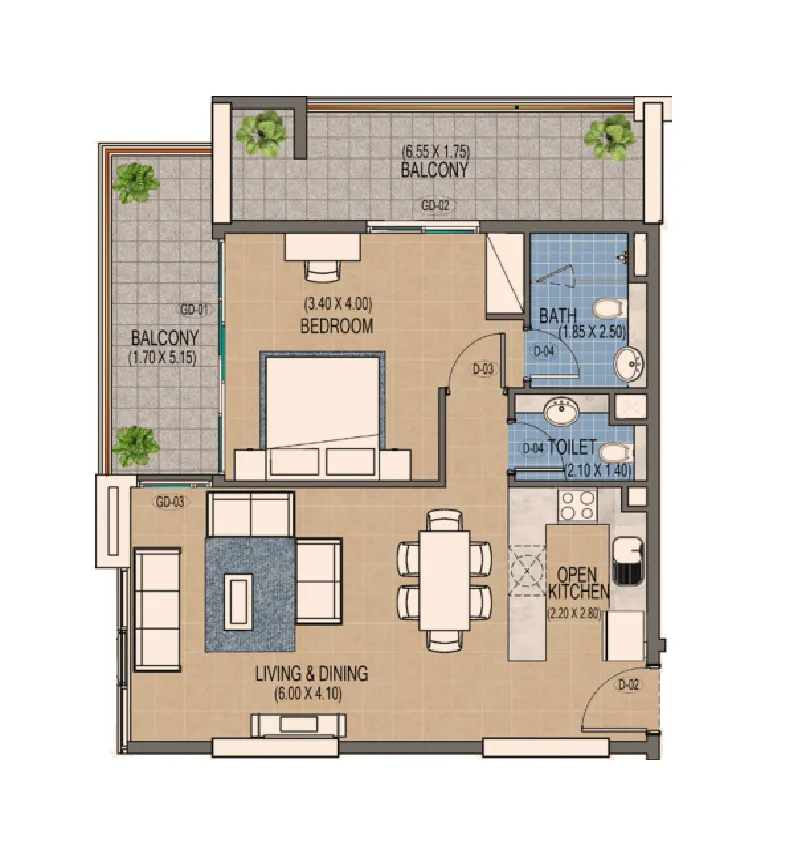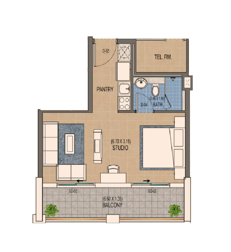 The exterior architecture is defined by clean, elegant lines, expansive balconies, and glass railings that enhance openness and natural light. Thoughtfully integrated landscaping introduces greenery throughout the development, softening the modern design and reinforcing the upscale character of the surroundings. The project offers a selection of residential layouts, including studios as well as one- and two-bedroom apartments, allowing for flexibility to suit different lifestyles and living preferences.