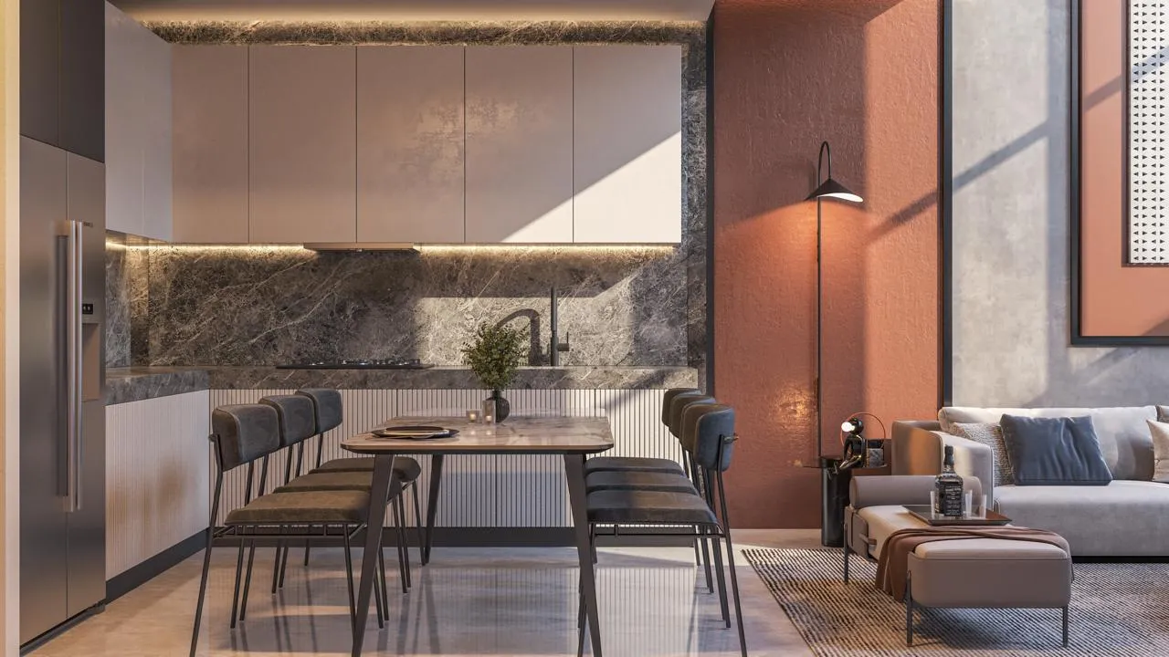 Interior finishing emphasizes contemporary style and the use of quality materials, with well-designed kitchen cabinetry and countertops, built-in wardrobes, and refined interior detailing. Townhouses and apartments alike receive the same attention to craftsmanship, ensuring durability and a polished aesthetic. Carefully selected materials and fittings create a modern, comfortable atmosphere across every room.