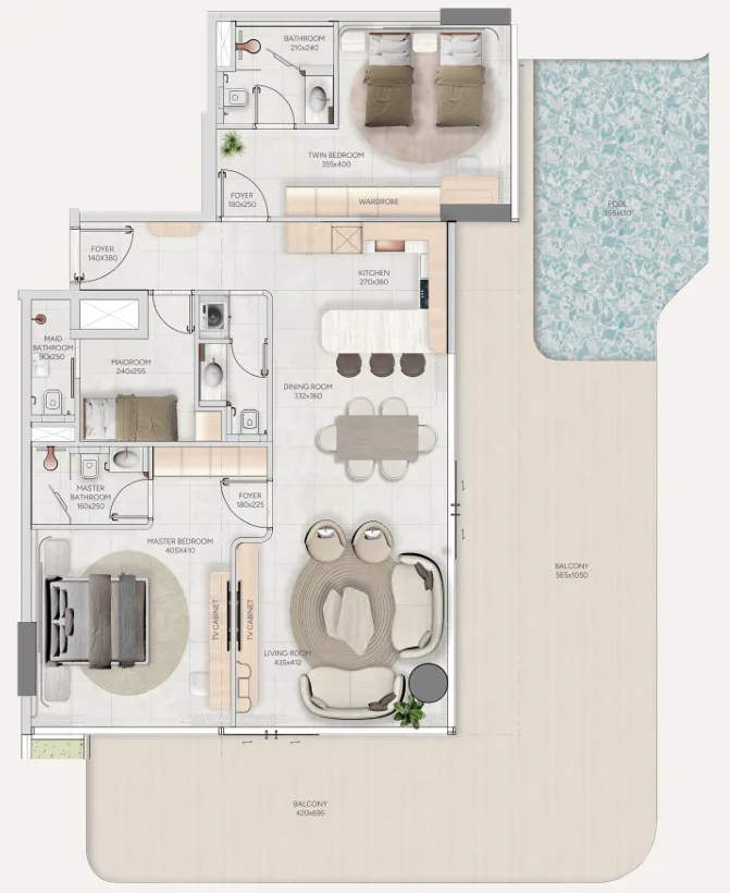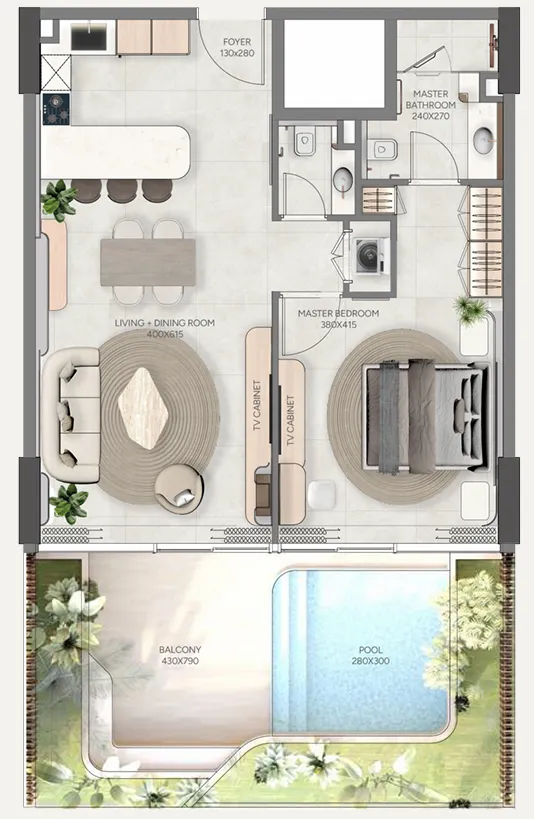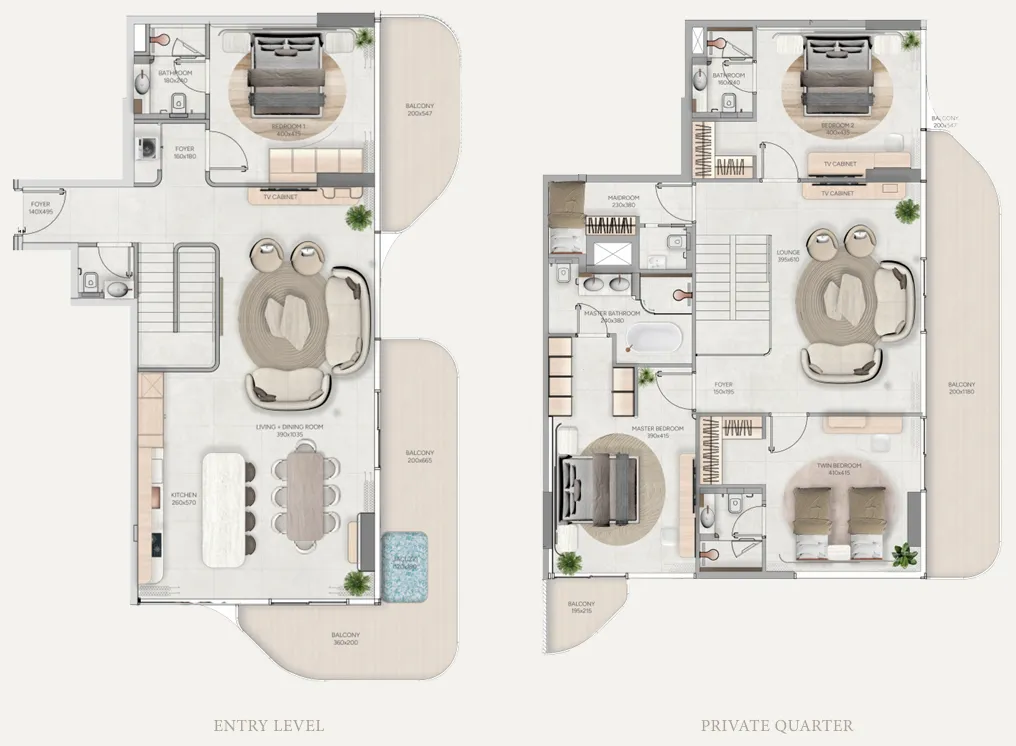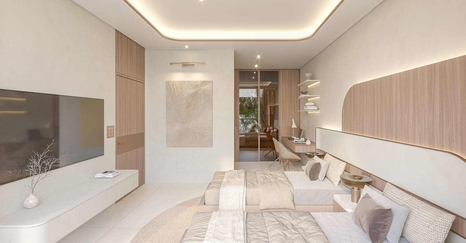 The residences include one-, two-, and three-bedroom apartments, as well as four-bedroom townhouses and penthouses. Each home is fully furnished, thoughtfully designed with open layouts, natural textures, and private outdoor spaces such as terraces, balconies, or even jacuzzis. Complementing the residences, Vestoria Bay Club offers a curated lifestyle across multiple levels — from family pools and kids’ play zones to an open-air cinema, rooftop lounge, wellness terrace, and modern fitness hub. Together, they create a vibrant community atmosphere within an elegant coastal retreat.