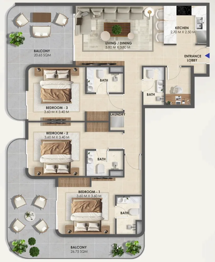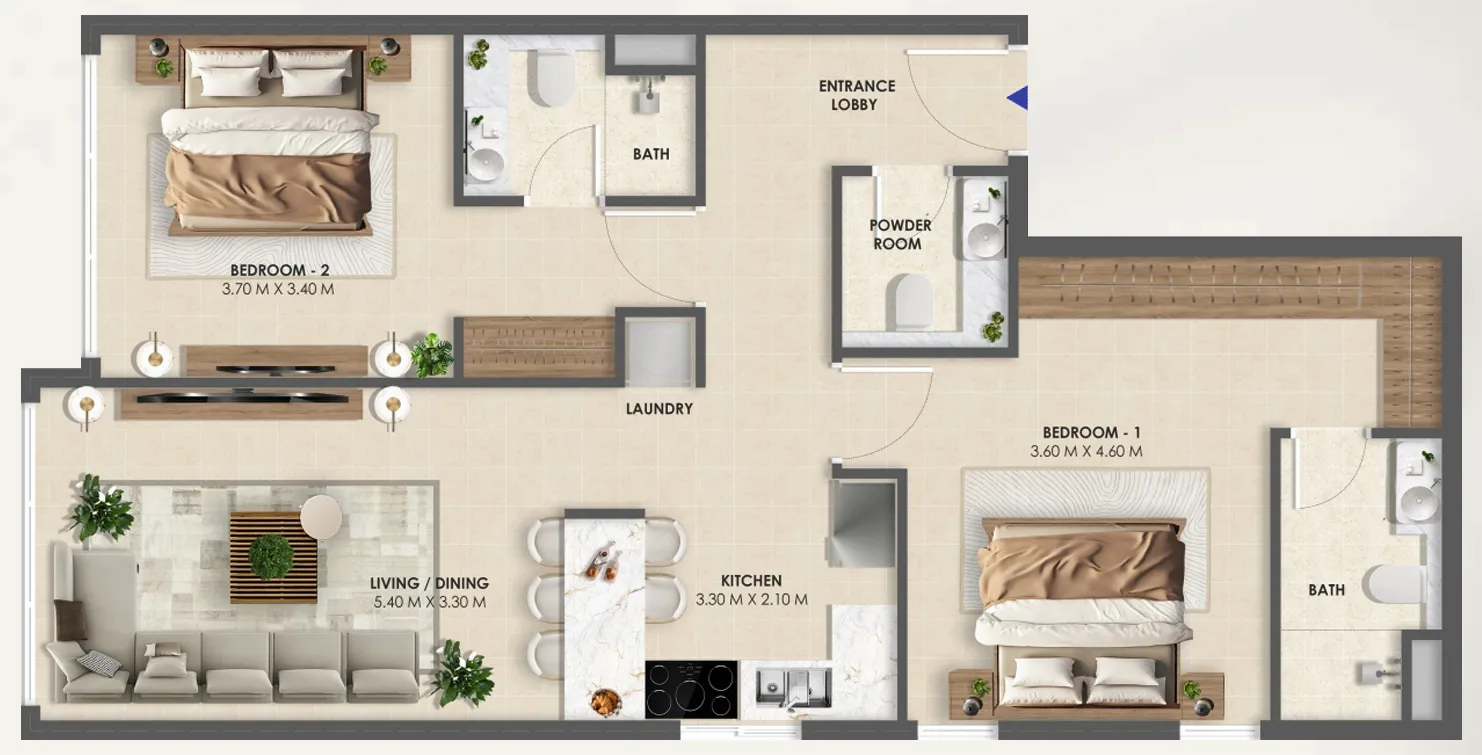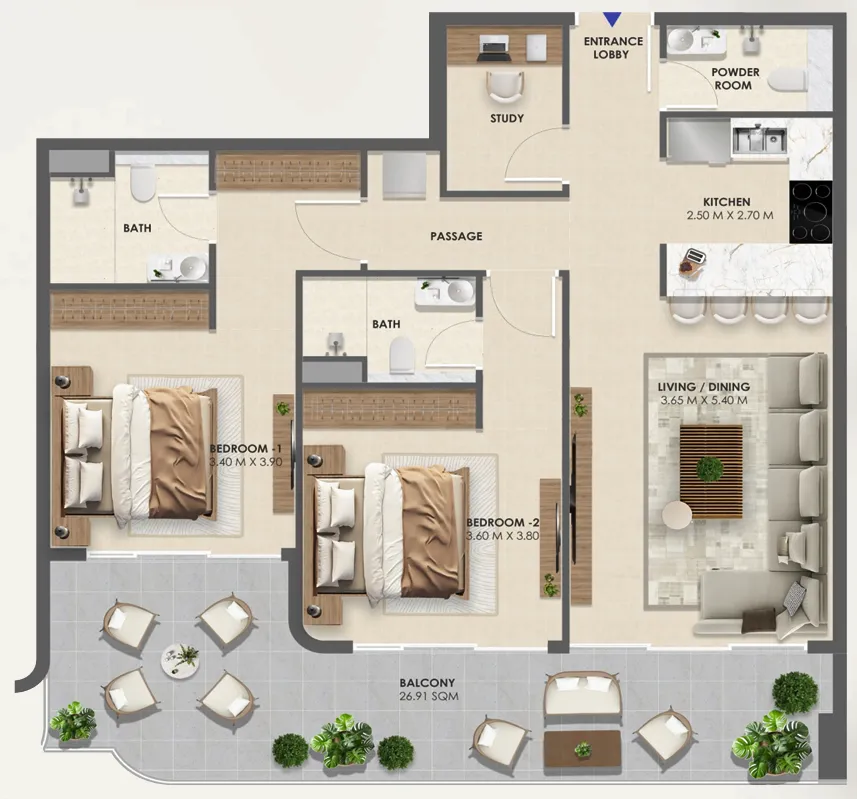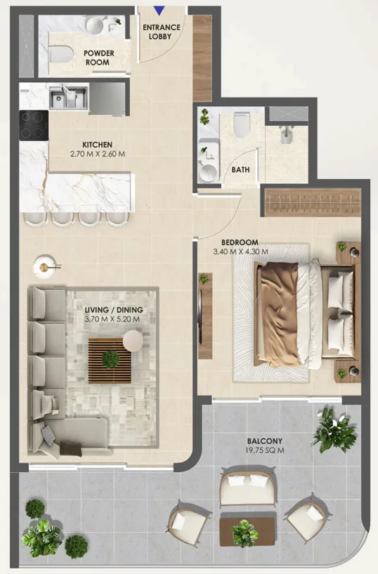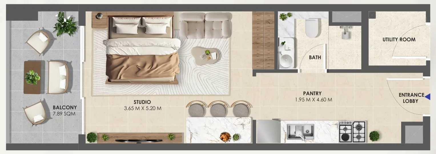 The project offers a curated collection of studios, one-, two-, and three-bedroom apartments, including layouts with dedicated study areas. Interiors are designed to feel open and airy, combining generous proportions with practical spatial planning that enhances daily living. Thoughtfully arranged circulation, elegant lobby spaces, and carefully positioned amenities create a seamless residential flow that balances privacy with a strong sense of belonging.