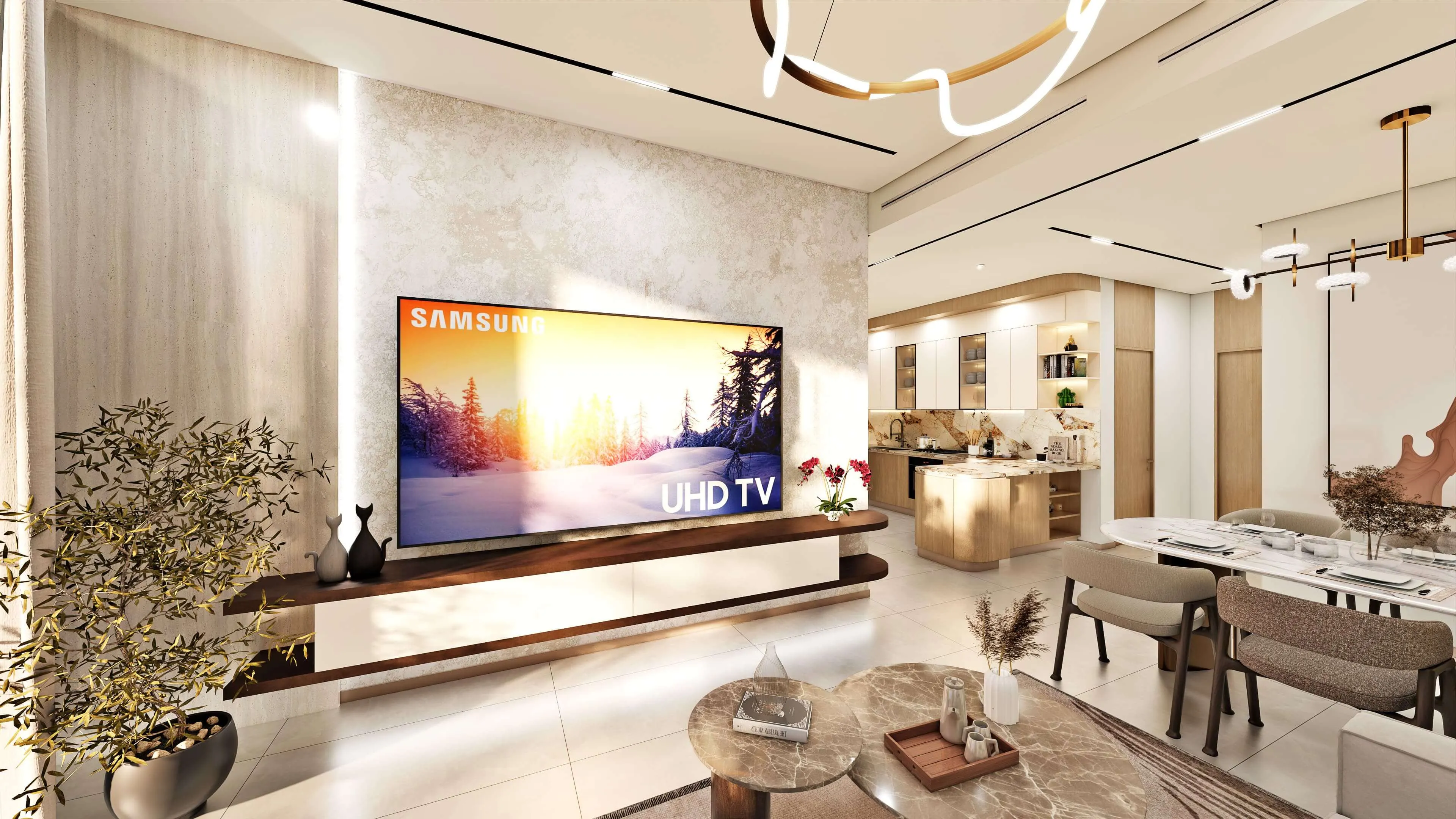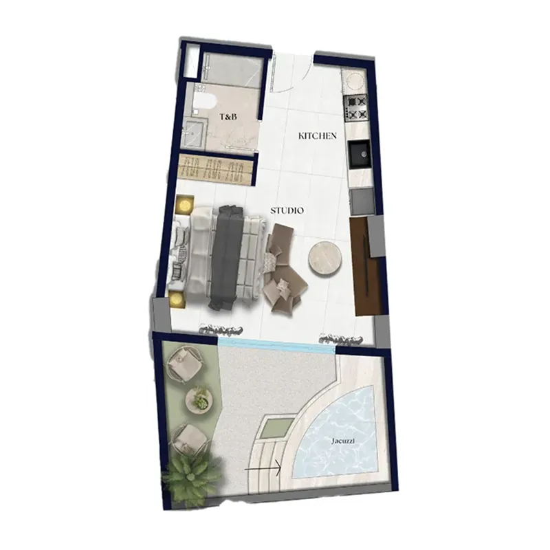 Xenia Residence features warm, natural interior palettes with wood-inspired finishes, soft lighting, and contemporary design accents. Bathrooms include modern sanitary fixtures, while living spaces are crafted with high-quality materials that emphasize comfort and durability. Select residences include private plunge pools, offering a refined touch that complements the project’s serene architectural character.