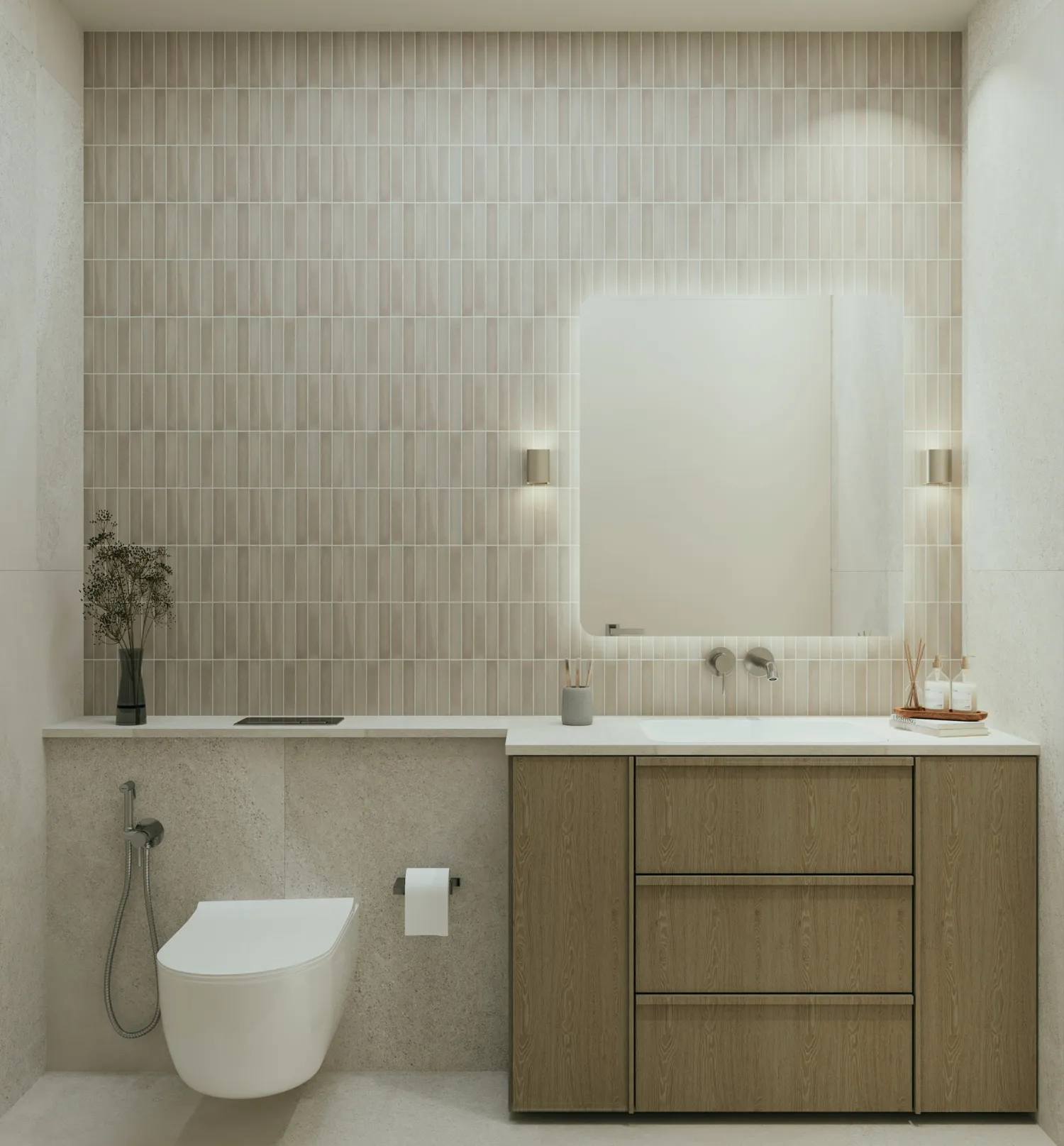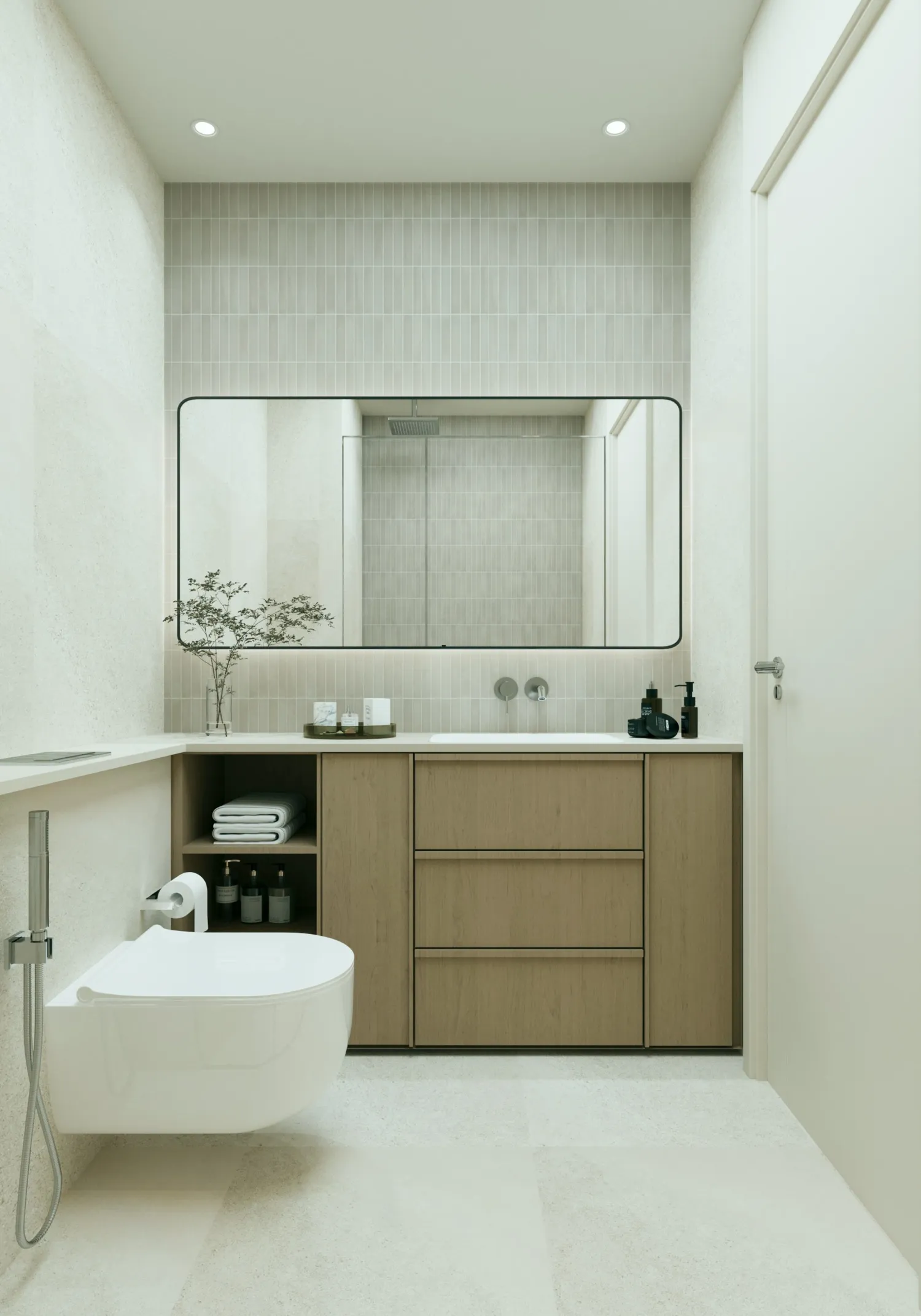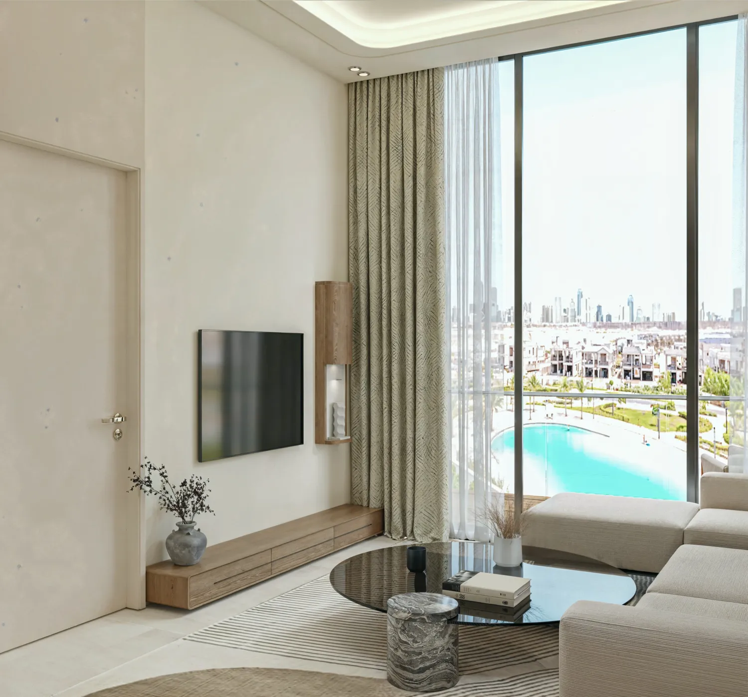 Interiors are finished in a modern, minimalist style with calm, natural palettes and refined materials. Living spaces feature high-quality flooring, elegant wall finishes, and large windows that enhance natural light. Kitchens are designed with clean cabinetry, stone countertops, and integrated appliances, while bathrooms reflect a spa-like aesthetic with premium sanitary fittings and contemporary detailing. The apartments are equipped with a Smart Home system for convenient control of key home functions. Apartments are delivered unfurnished, allowing residents to personalize their living spaces while enjoying the project’s refined base specifications.