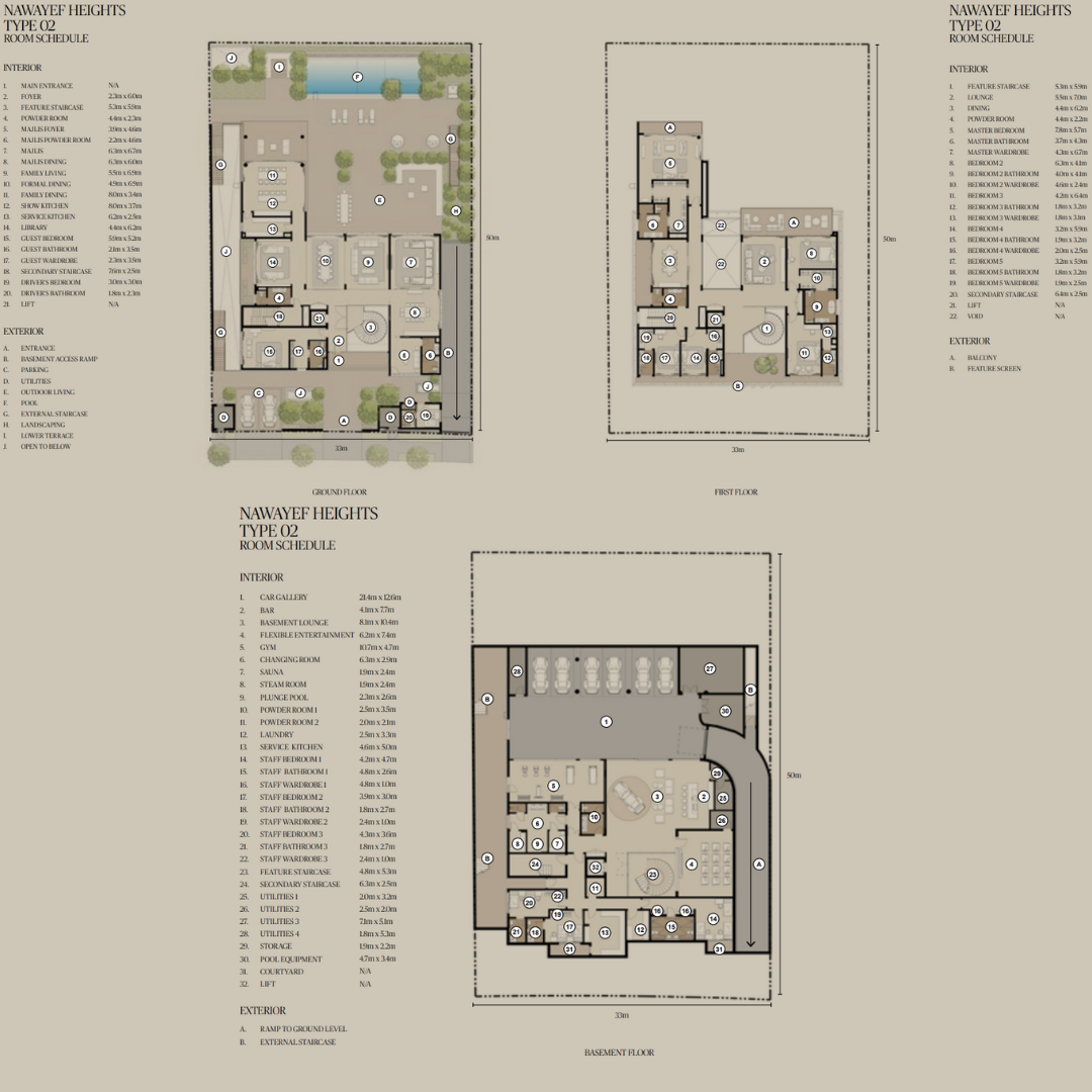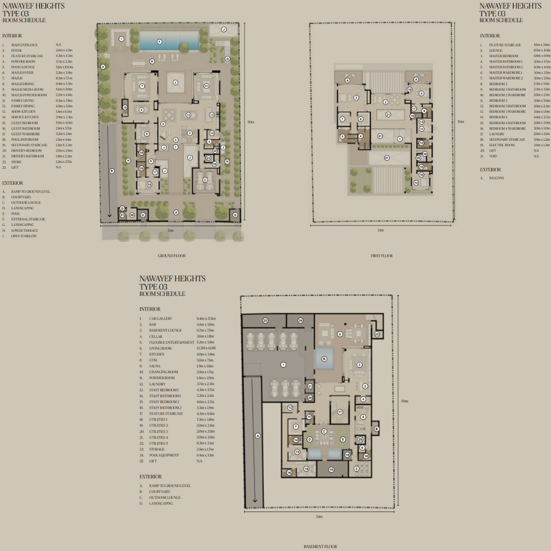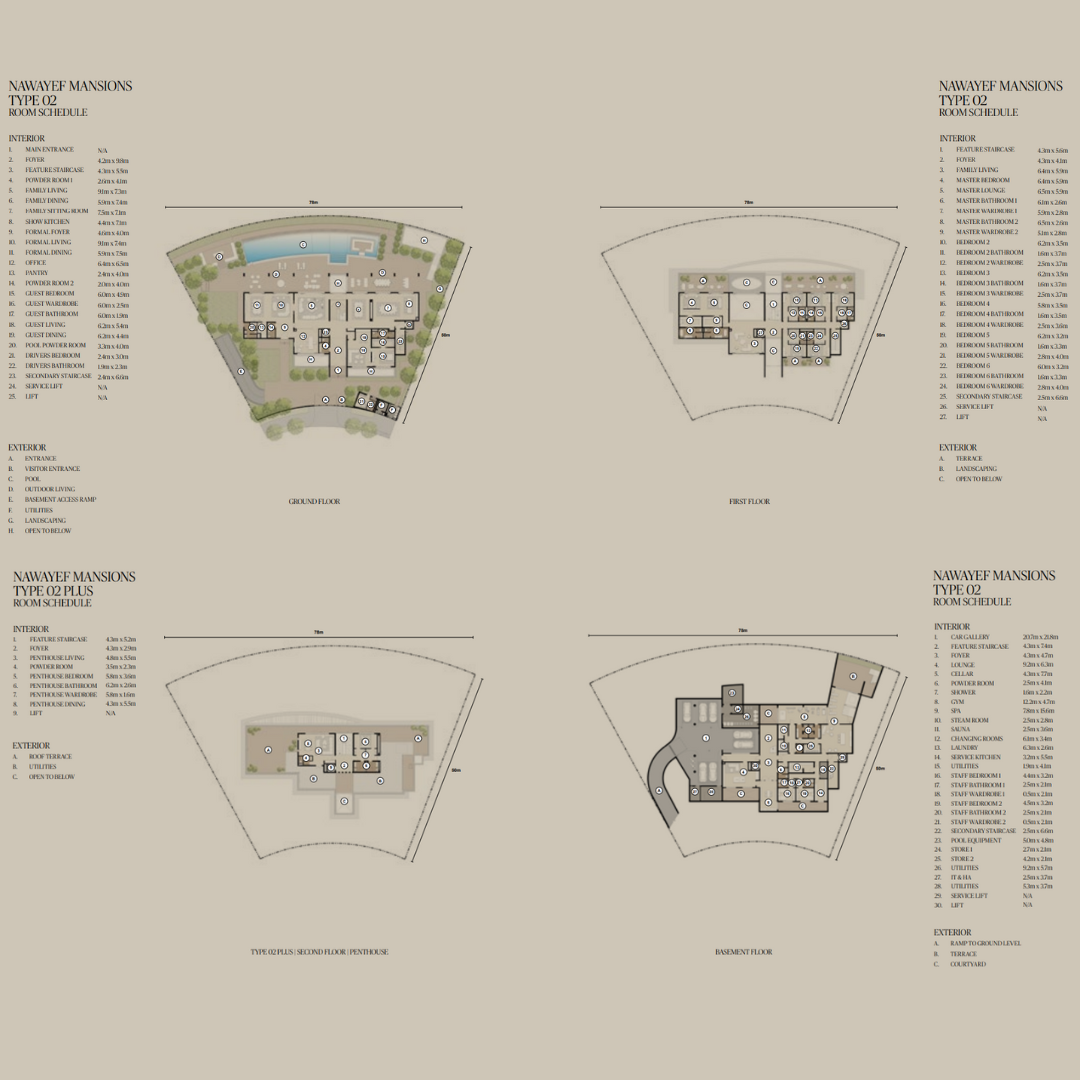 The development is composed of three curated collections: Mansions, Heights, and Homes. Layouts vary from 4-bedroom villas to grand 8-bedroom mansions, with spaces spanning 370 sqm to 3,800 sqm.