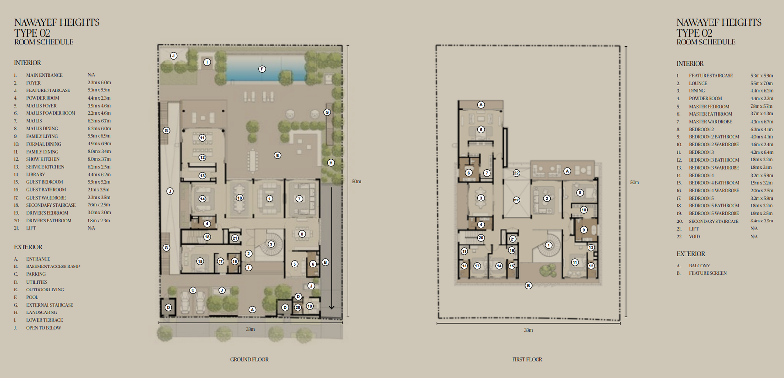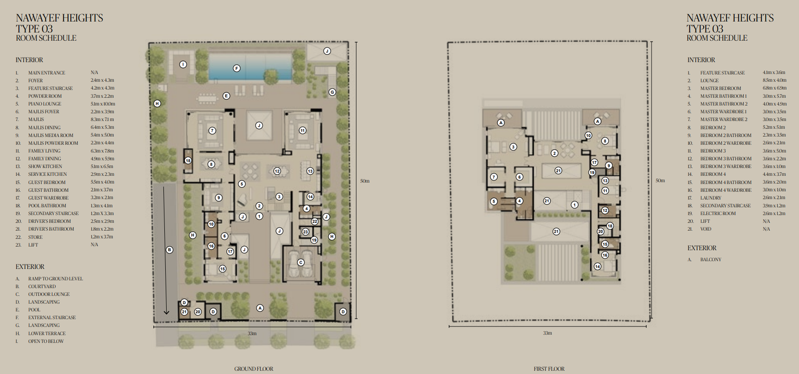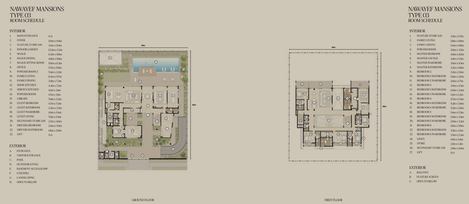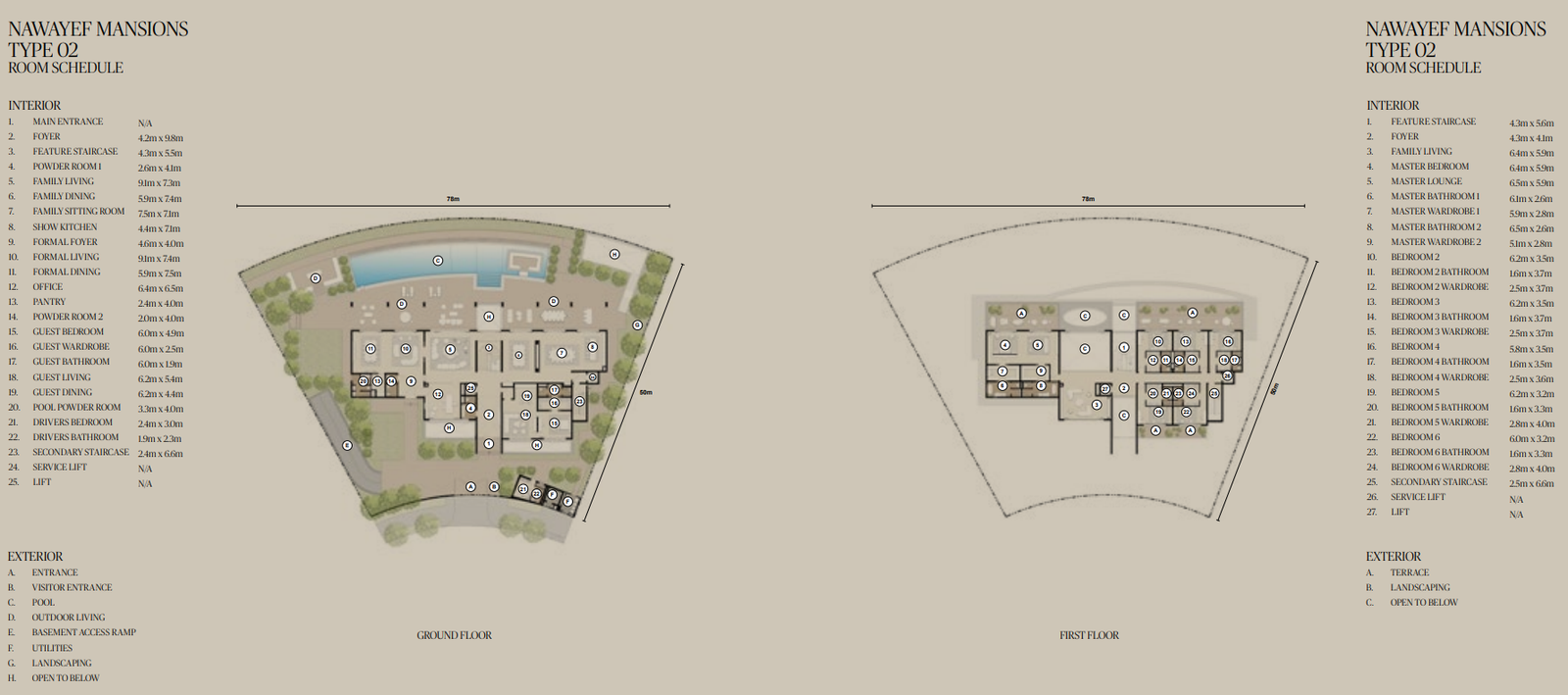 The Mansions range from approximately 18,138 to 29,063 square feet, the Heights Villas from 12,885 to 21,011 square feet, and the Homes from 3,983 to 5,038 square feet, each crafted to maximise privacy, light, and panoramic views.