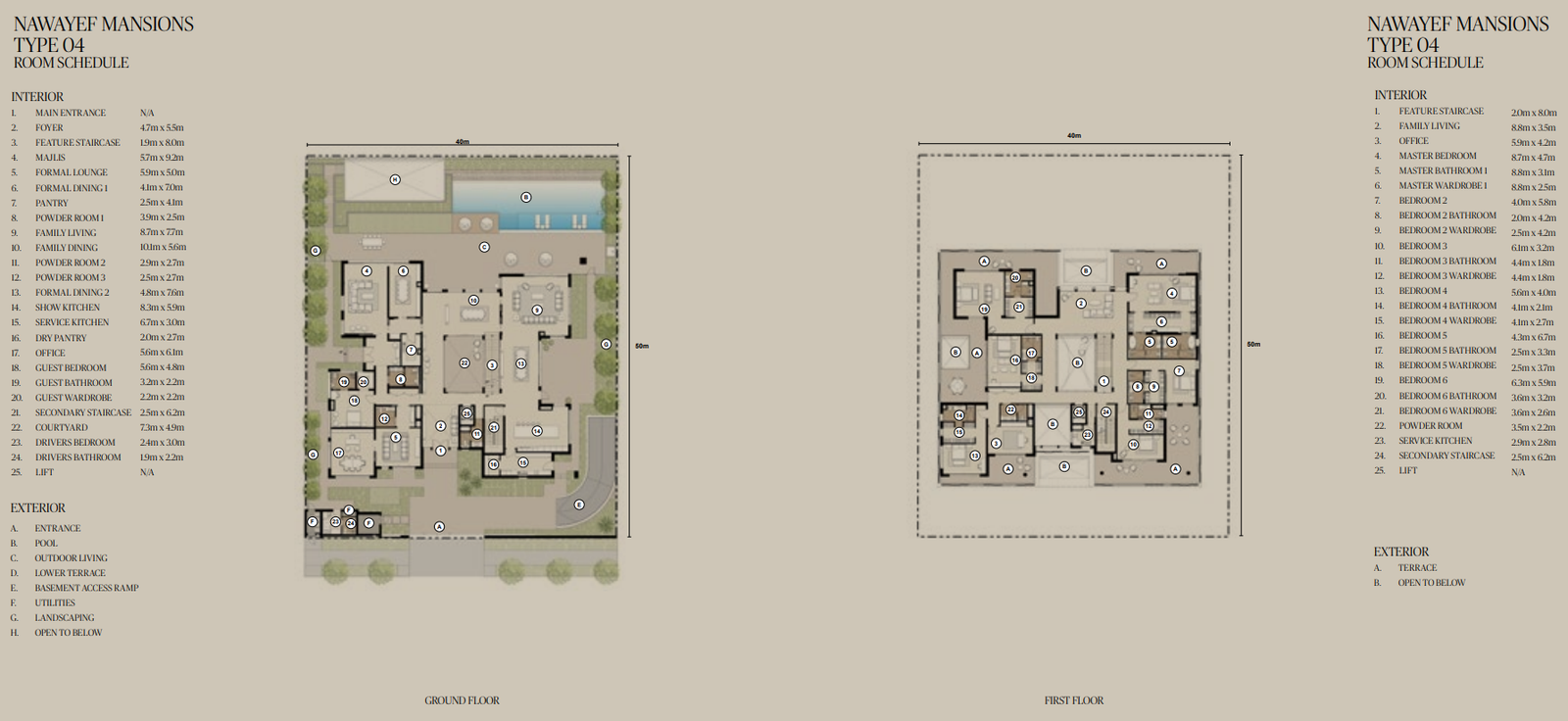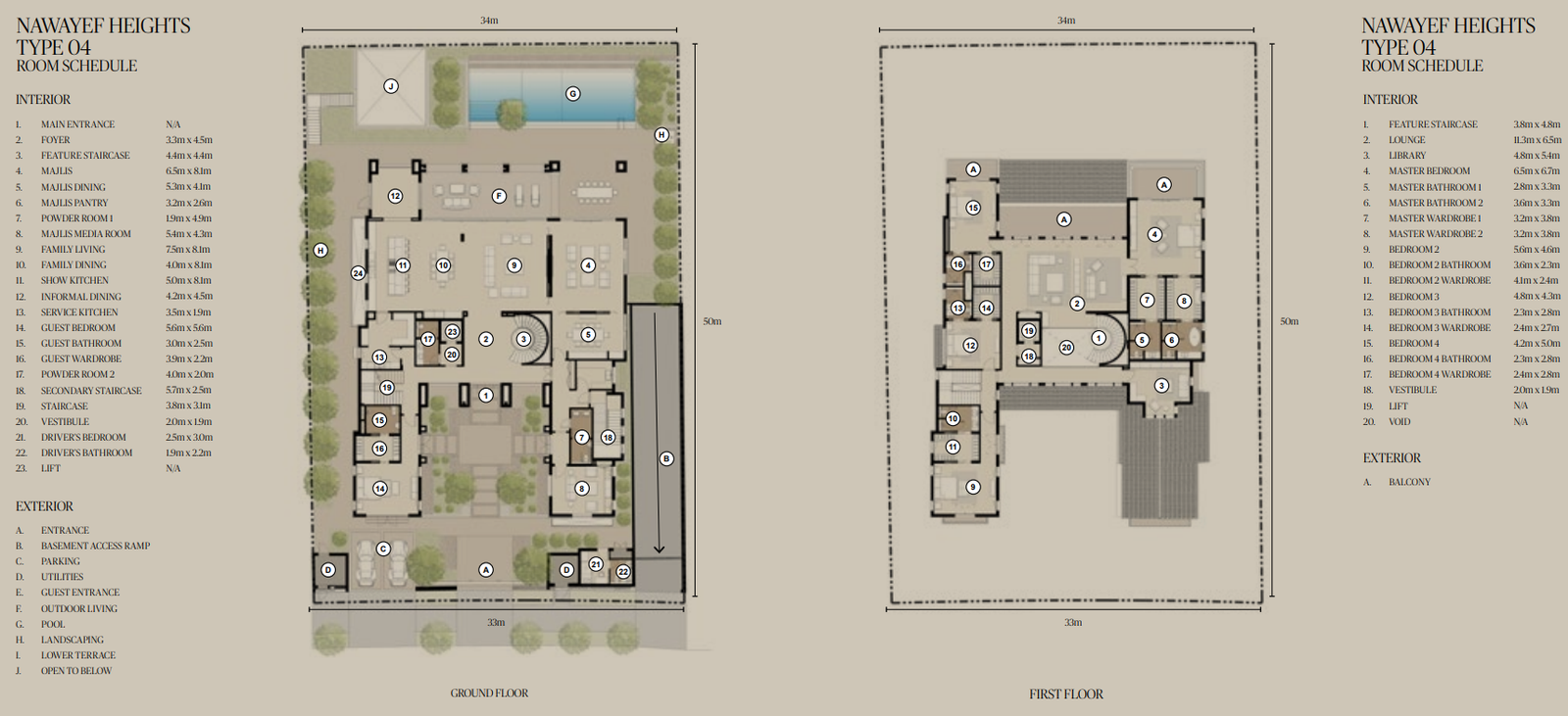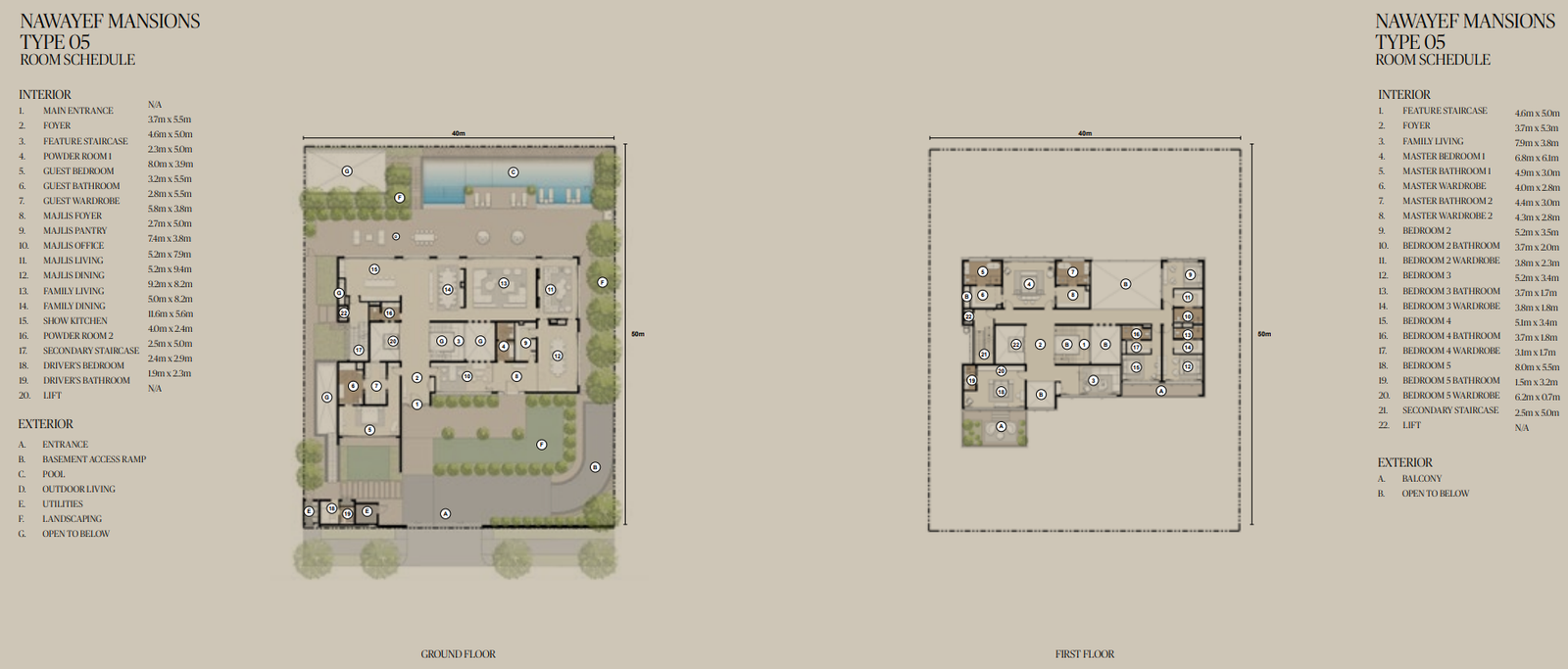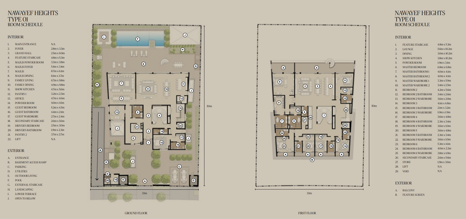 The Mansions range from approximately 18,138 to 29,063 square feet, the Heights Villas from 12,885 to 21,011 square feet, and the Homes from 3,983 to 5,038 square feet, each crafted to maximise privacy, light, and panoramic views.